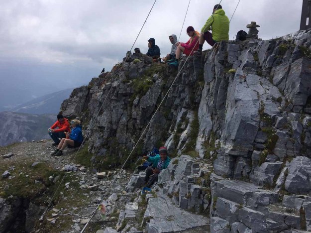 Wir haben uns ein etwas windstilles Plätzchen am Gipfel ausgesucht, daher können wir eine Zeit lang bleiben, aber trotzdem ist das Wetter heute nicht so toll, als daß man hier Stunden bleiben möchte.