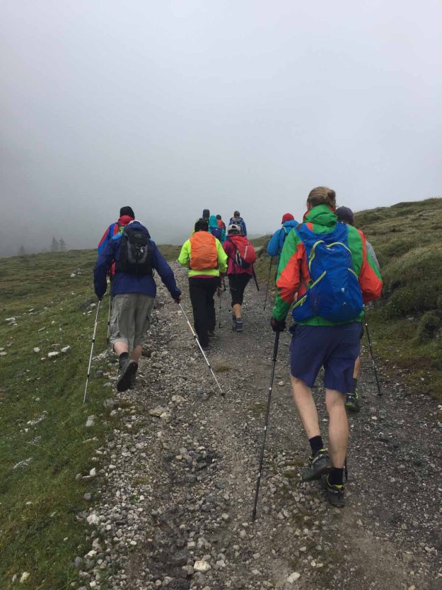 Es wird kühler, daher gehen wir schnell weiter. Nun setzt immer wieder leichter Regen ein, jedoch nicht störend. Eigentlich haben wir perfektes Wanderwetter. Einzig der Weg ist arg in Mitleidenschaft gezogenen und sehr rutschig, kein Wunder bei den Maßen an Wanderern.