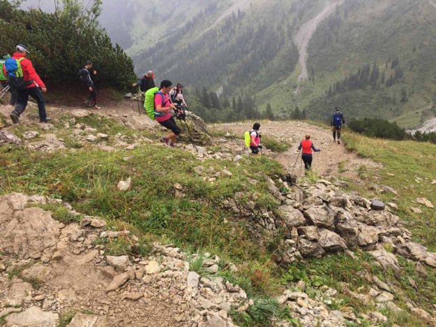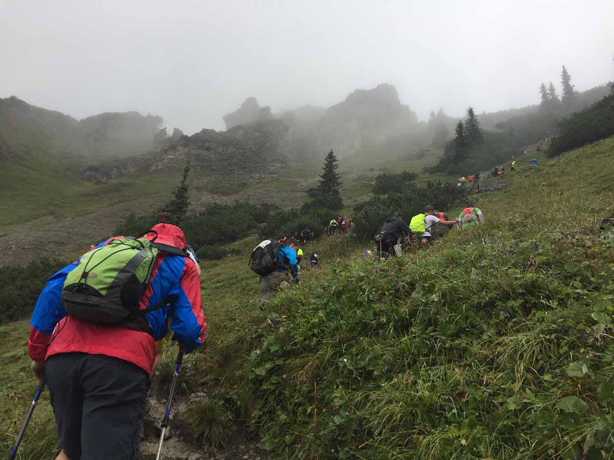 Um 6:00 Uhr fällt der Startschuss, nach schöner Tiroler Art mit Kanone. Dann setzen sich die Läufer und Wanderer in Bewegung. Das befürchtete Schubsen und Stechen mit Wanderstöcken fällt zwar aus, aber es ist gerade in der Anfangsphase sehr stressig. Das legt sich erst nach einer Weile…