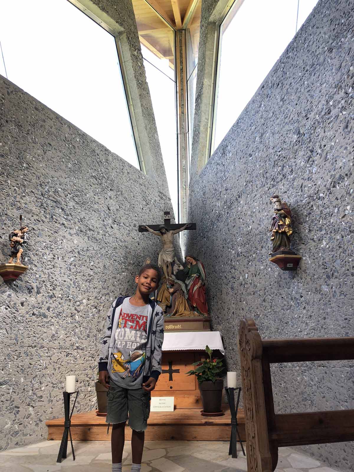 Wir starten unsere Wanderung bei der wunderschönen und modernen Kapelle, die den Eingang des Padastertals seit ein paar Jahren ziert.