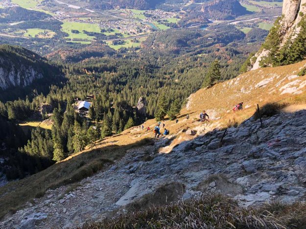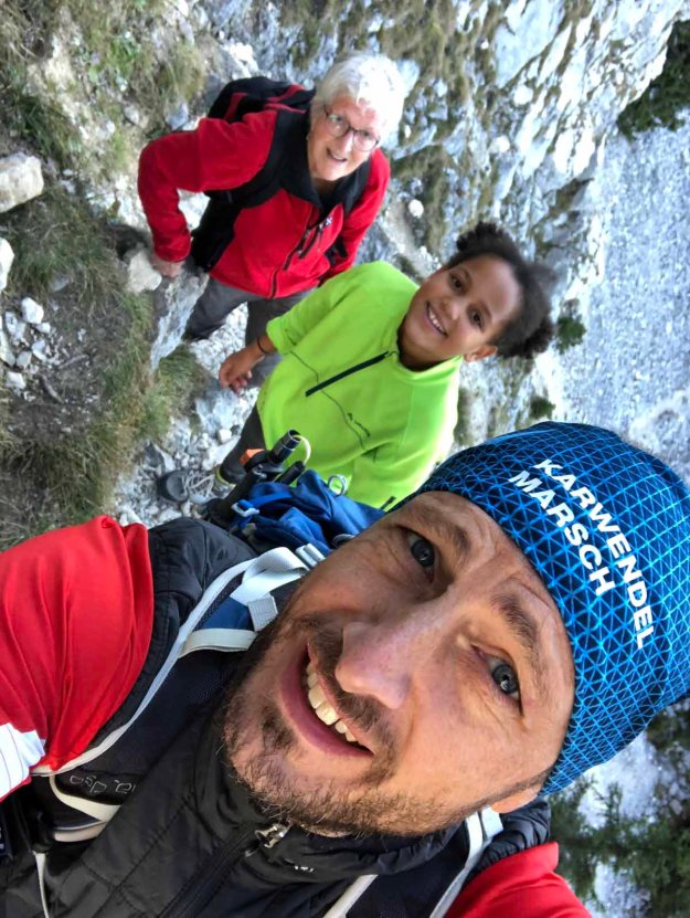 Lange bleibe ich nicht auf dieser windigen Kanzel, schon bald treibt es mich hinunter zum Sattel, dort treffe ich mich wieder mit der lustigen Wanderschaft… ein kurzer Schluck aus der Wasserflasche und ein Müsliriegel, dann machen wir uns auf den Abstieg durch die Felswand.