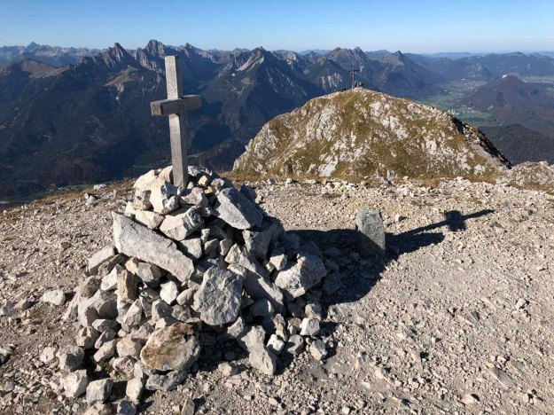 Während Oma, Sara und Letu es sich in der Sonne gemütlich machen und dem Wind ausweichen, beschließe ich, noch schnell auf den Gipfel raufzugehen. Es ist ja nicht mehr weit. Schon nach ein paar Schritten befinde ich mit auf der Leeseite des Windes, hier ist es relativ warm für die Jahreszeit. Bald schon stehe ich auf dem Gipfel. Hier verweile ich nur kurz, denn ich möchte auch noch zum eigentlichen Gipfel des Säulings, der 80m östlich, zwar nur mit kleinem Gipfelkreuz, aber dafür mit der echten Höhe.