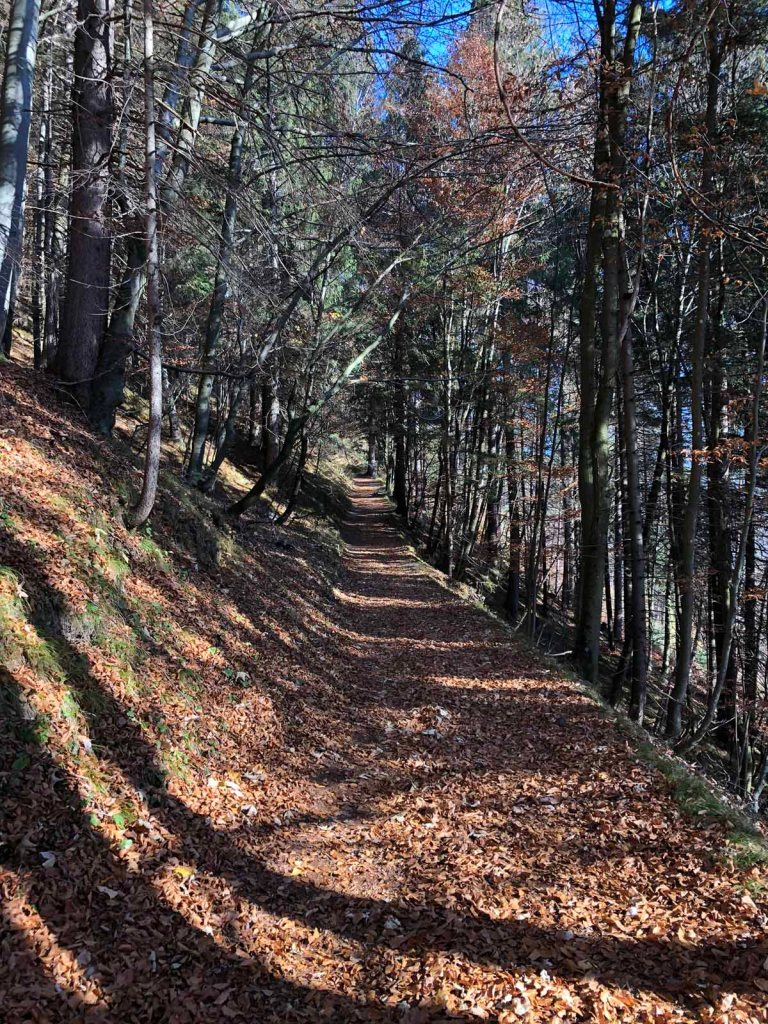 Von hier geht es zu Fuß hinauf, immer auf schönen Steigen durch den herbstlichen Wald. Von Zeit zu Zeit bleibe ich stehen und suche nach den hier versteckten Dosen der Dharma-Initiative. Die Rätsel zu diesem Cachetrail hatte ich schon zu Hause gelöst, jetzt ist noch das Dosenklauben ausständig.