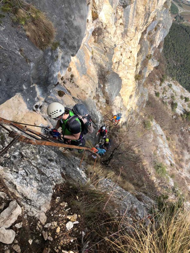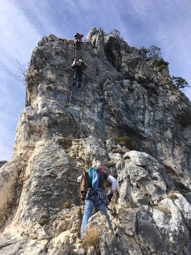 Vor dem Gipfel haben wir dann nochmals ein paar kurze Leitern, die uns auf den Gipfel „Cima Sat [1.246m] bringt.