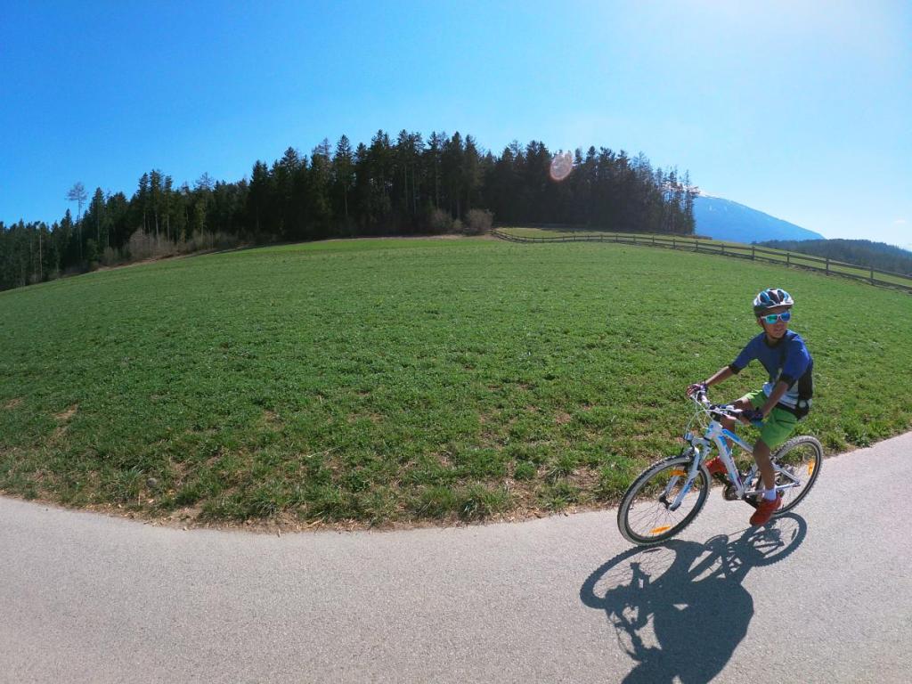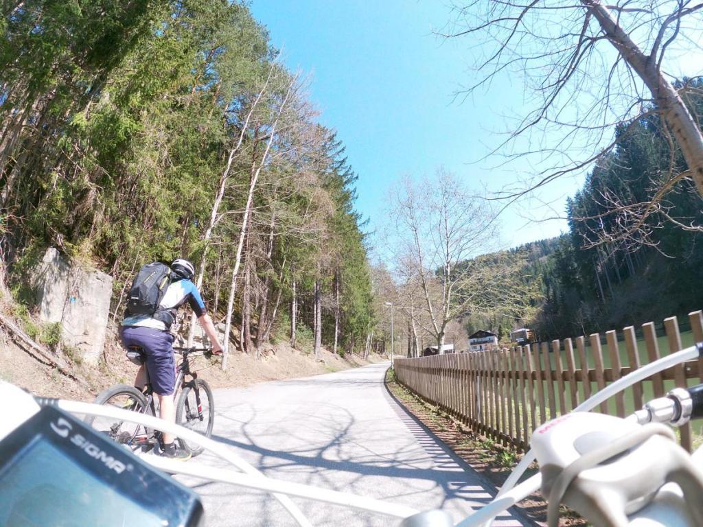 Letu und ich sind da natürlich eine Ausnahme, wir fahren immer noch Stromlos durch die Gegend, aber positiver Weise auch ohne „Nebengeräuse“ vom E-Bike. Über Kögl erreichen wir schlußendlich unser erstes Etappenziel, Kienberg. Hier zweigen wir ins Zimmertal ein, das uns immer weiter Richtung Hall in Tirol bringt.
