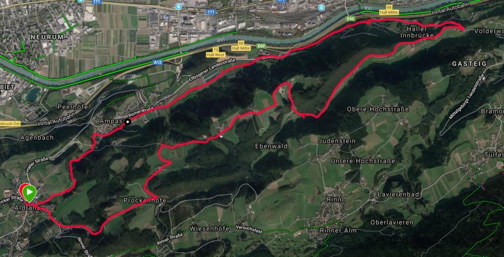 Nun noch eine Steigung, bis wir das Widum Ampass erreichen, über die Felder und wieder auf den Weg, den wir gestern schon „genossen“ haben, allerdings in die verkehrte, nach unten führende Variante. Nun müssen wir uns hinauf zum Fussballplatz kämpfen, das ist eine ganz nett steile Steigung. Auch diese meistert Letu mit Bravour… die Aldranser Alm läßt grüßen…
