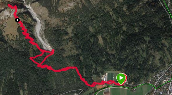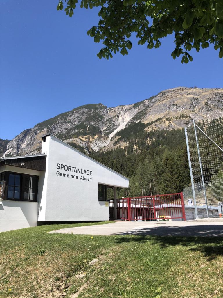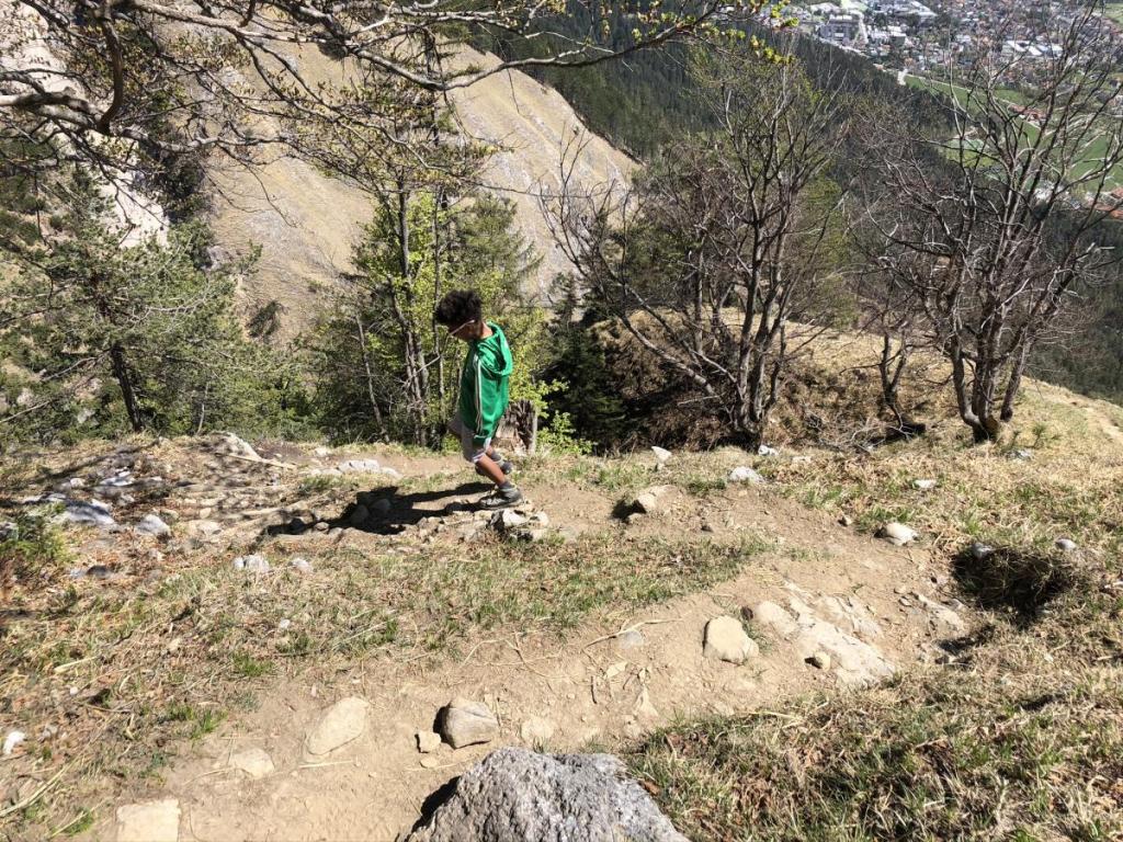 Wir starten beim Sportplatz in Absam, und müssen ein paar Meter auf Asphalt laufen. Aber dann sind wir schon auf einer Forststraße, das laufen wird angenehmer. Unterwegs „klauben“ wir einen Geocache auf, dann erreichen wir auch schon die „Weiße Reisn“…
