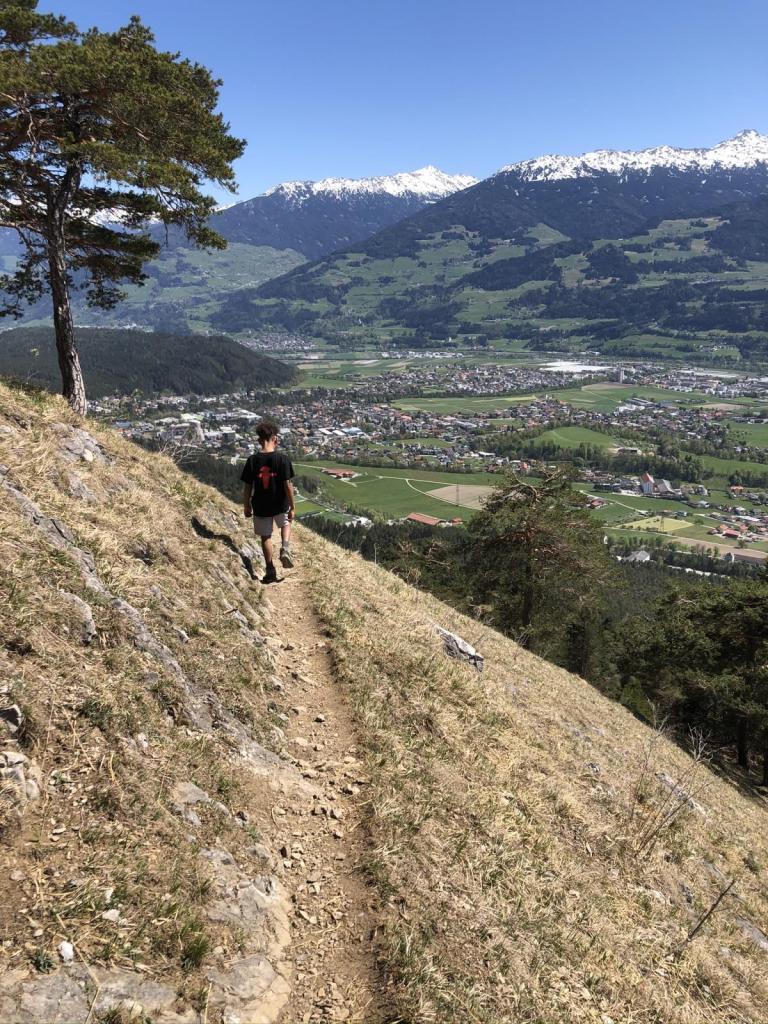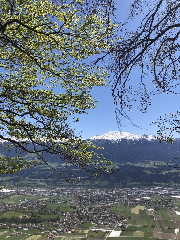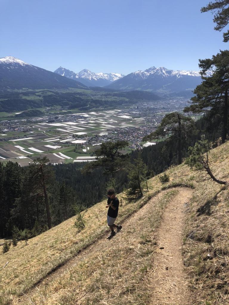 Die Aussicht auf unserem Rastplatz ist auch phänomenal, schöne Fernsicht und die wunderbaren Gipfel wie Patscherkofel, Serles, Habicht und die Stubaier Gletscherwelt lassen grüßen. Nach einer ausgiebigen Pause machen wir uns wieder auf ins Tal…