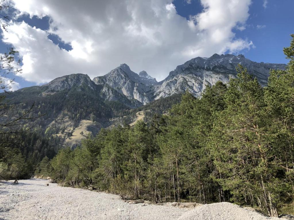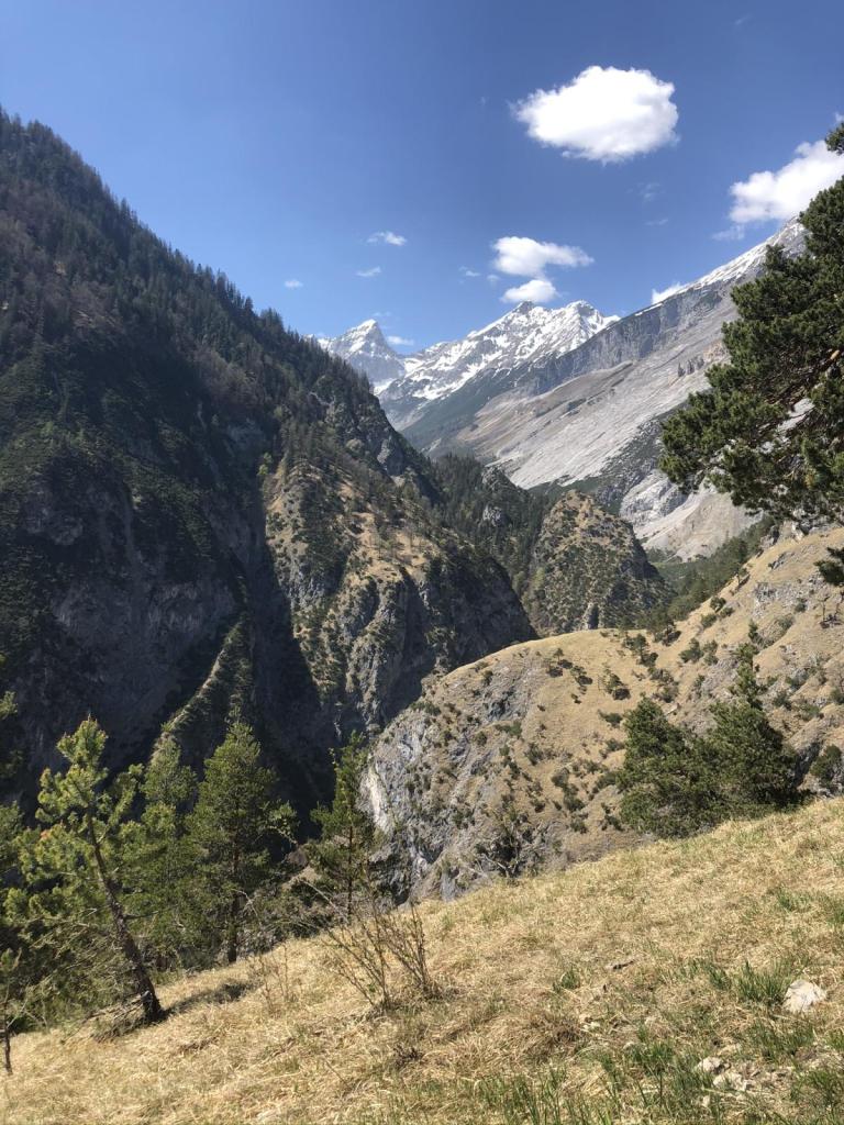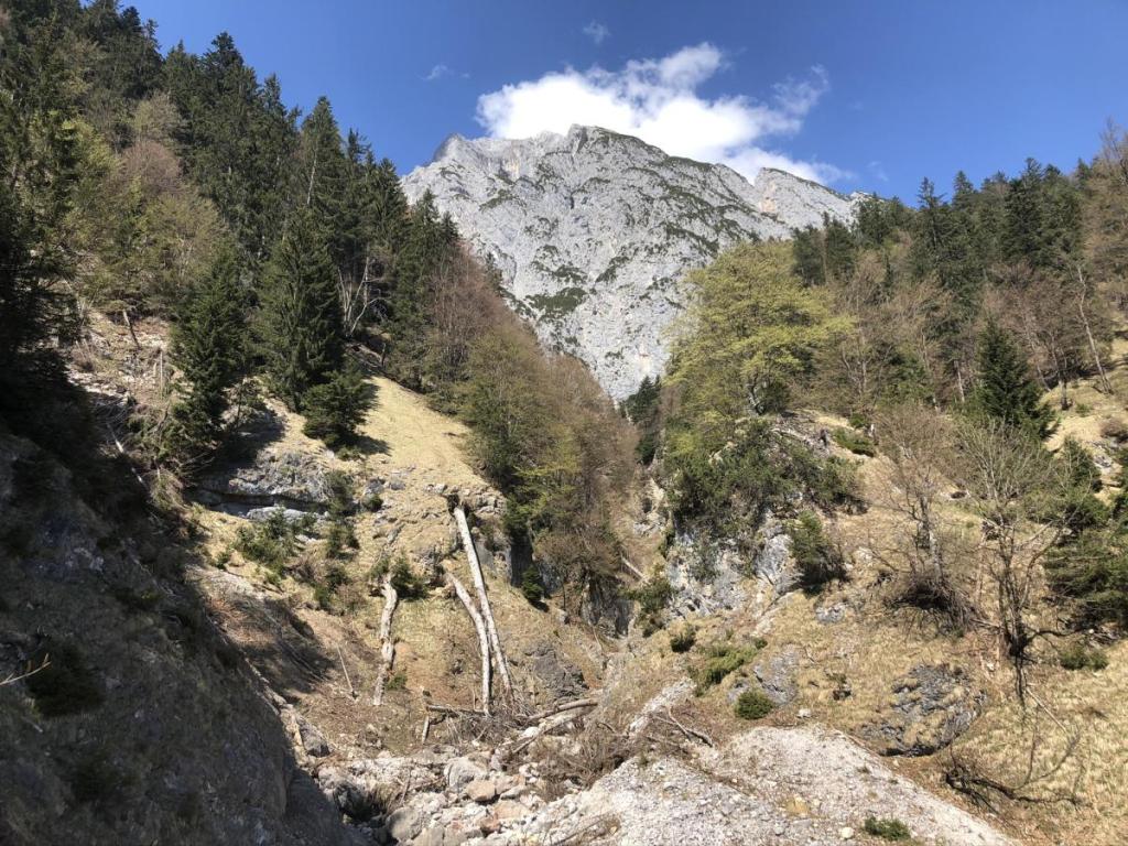 Durch lichten Bergwald erreichen wir über Serpentinen immer mehr an Höhe. Dann stehen wir an einer Biegung, die sehr günstig einen wunderschönen Blick in mein Lieblingstal, das Halltal ermöglicht.