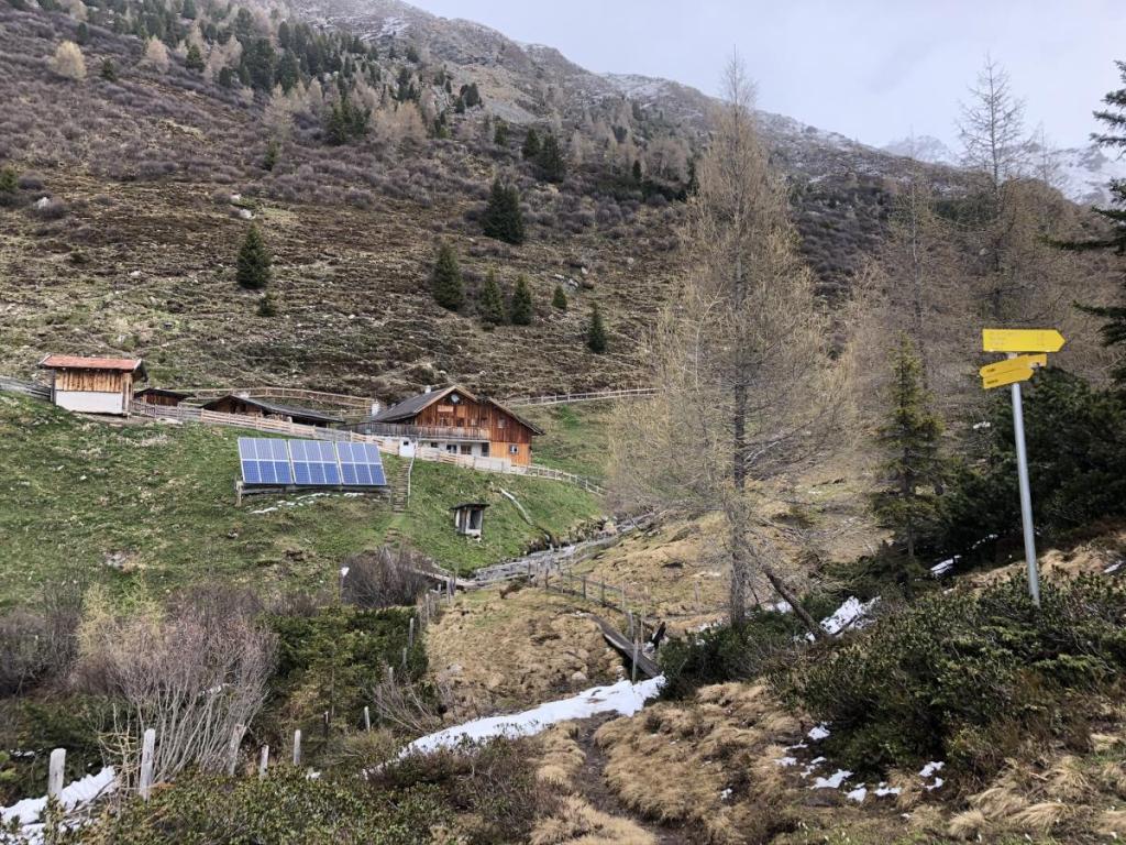 Über eine Kuppe steigend sehen wir endlich die Alm, ein großes Solarpanel als „Eyecatcher“ prominent davorgelagert.