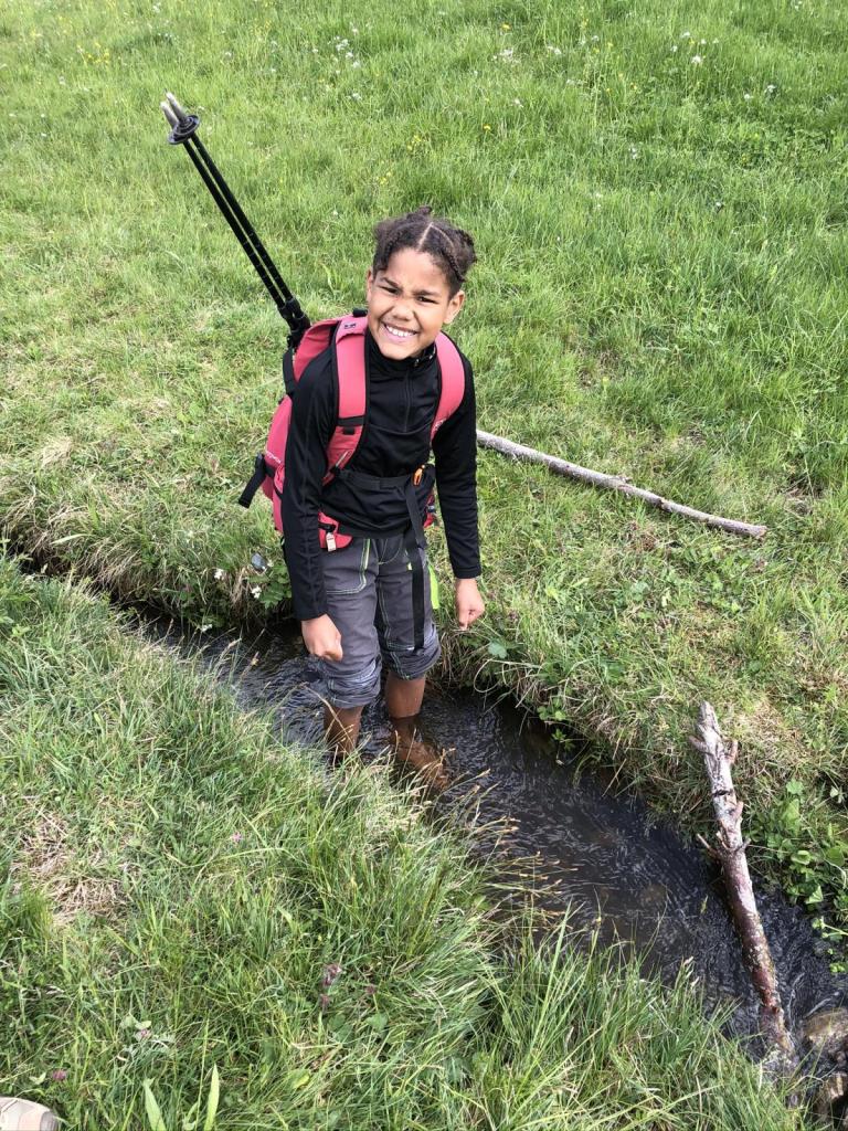 Ein kleines Bächlein teilt die Wiesen. Letu kann nicht wiederstehen und muss seine Füsse reinhängen. Lange bleibt er nicht stehen, schnell ist er wieder aus dem eisekalten Wasser herausgesprungen. Zufrieden und heute auch überglücklich, den Weg geschafft zu haben, erreichen wir wieder das Auto.