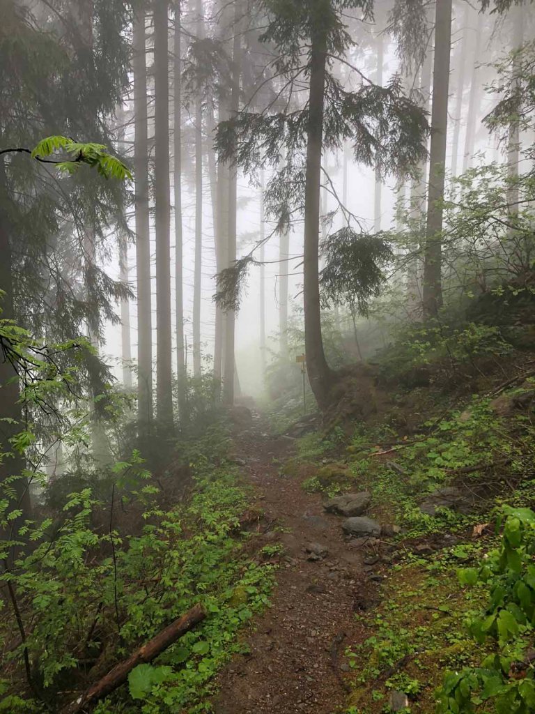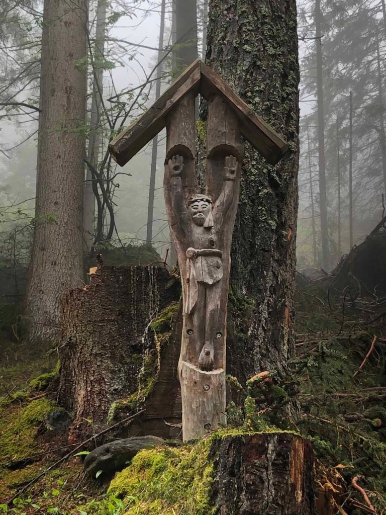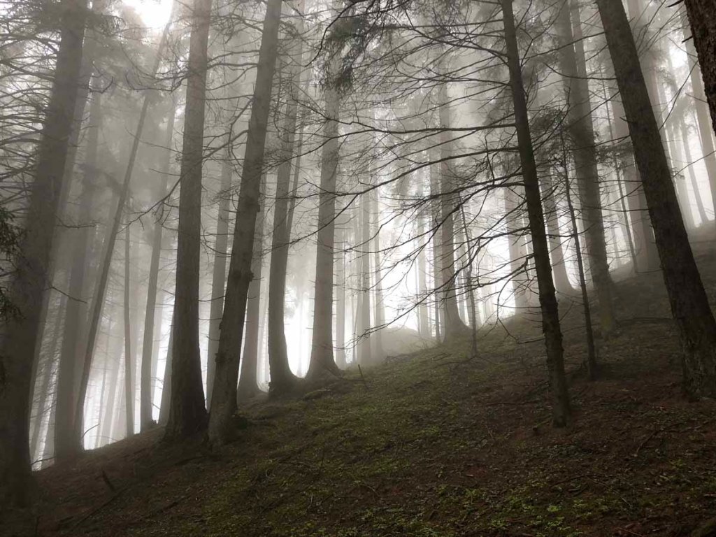 Das Wetter ist heute nicht so sonnig, trotzdem ist es relativ warm. Und es herrscht eine fast schon mystische Stimmung in dem wunderschönen Wald um den Wallfahrtort. Immer wieder bleiben wir im Wald stehen und genießen das Spiel des Nebels im Wald.