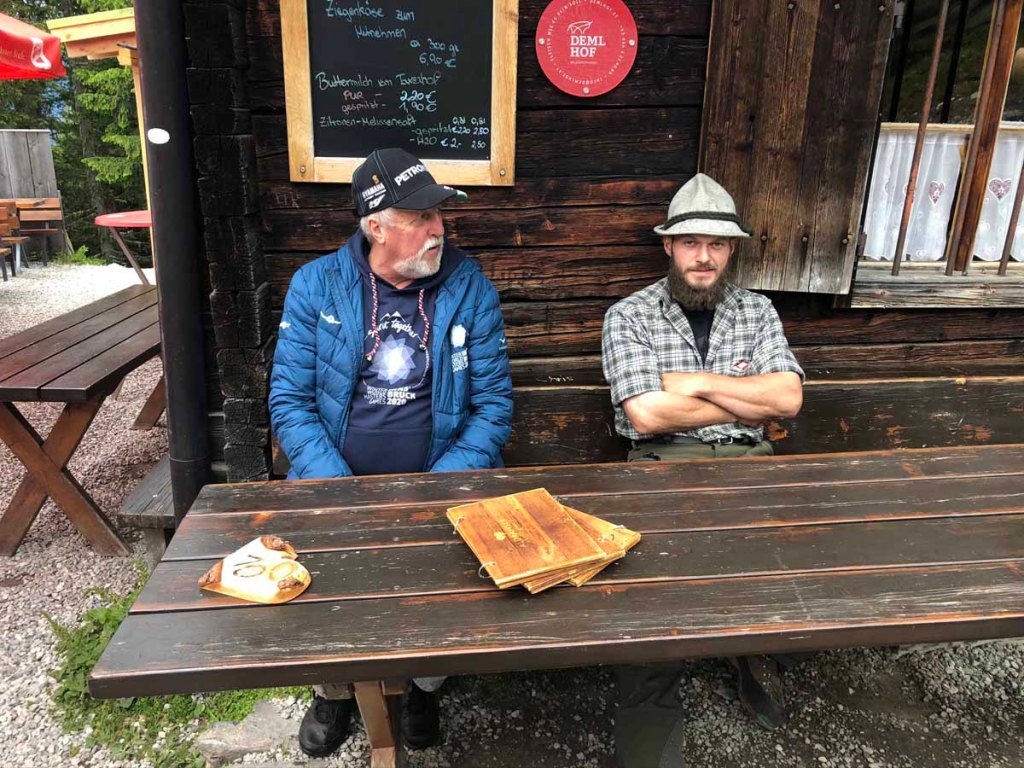 Da wir einiges zum transportieren haben für die Feuer, sind wir motorisiert auf der Alm. Übrigens hat die „Aldranser“ heuer einen neuen Pächter… die erste Probe der neuen Küche passt auf jeden Fall mal…