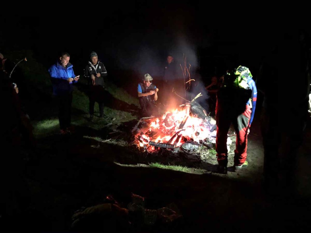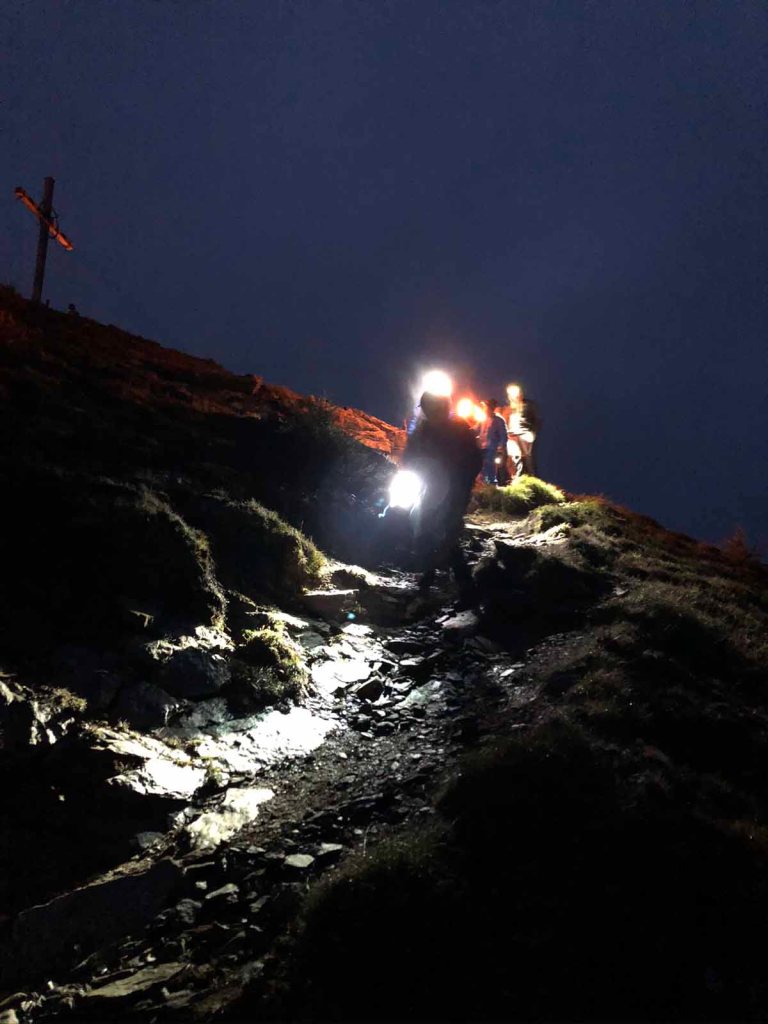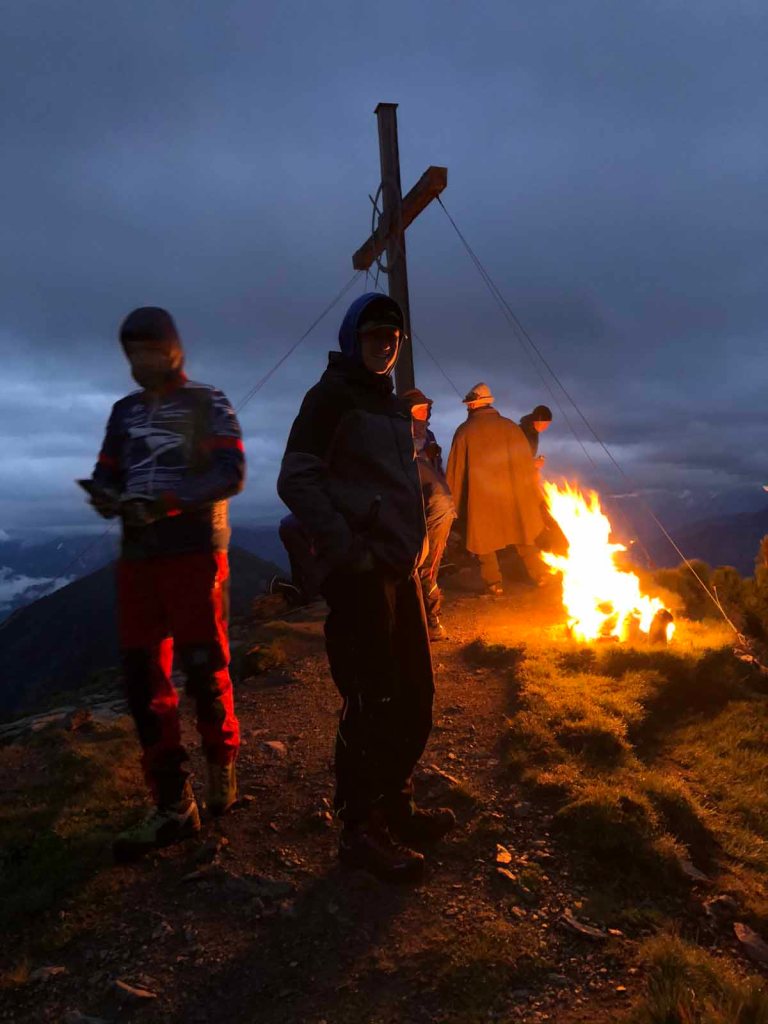 Es ist kühl geworden am Gipfel, daher stehen wir ein wenig um die Feuer und genießen die Aussicht ins Inntal. Dann bereiten wir uns für den Abstieg vor. Jeder hat eine Taschenlampe oder Fackel dabei, bedächtig steigen wir ab.