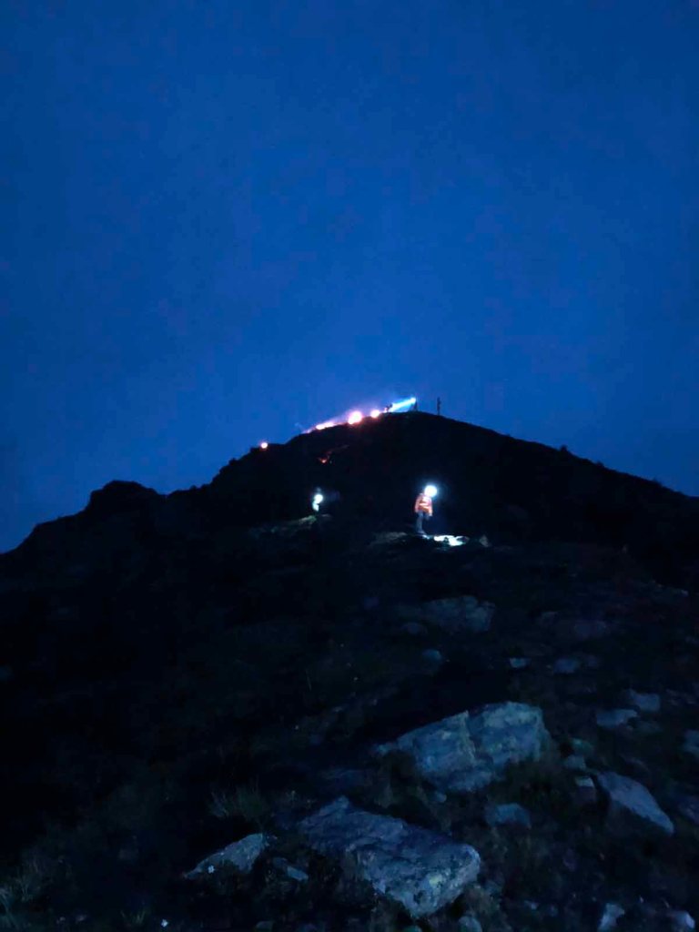 Im Rückblick sehen wir noch die Feuer am Gipfel, ein paar von uns sind noch zurückgeblieben…