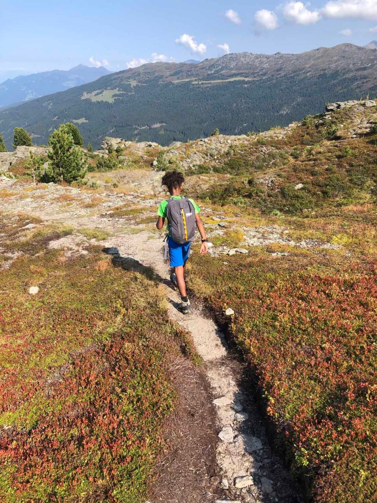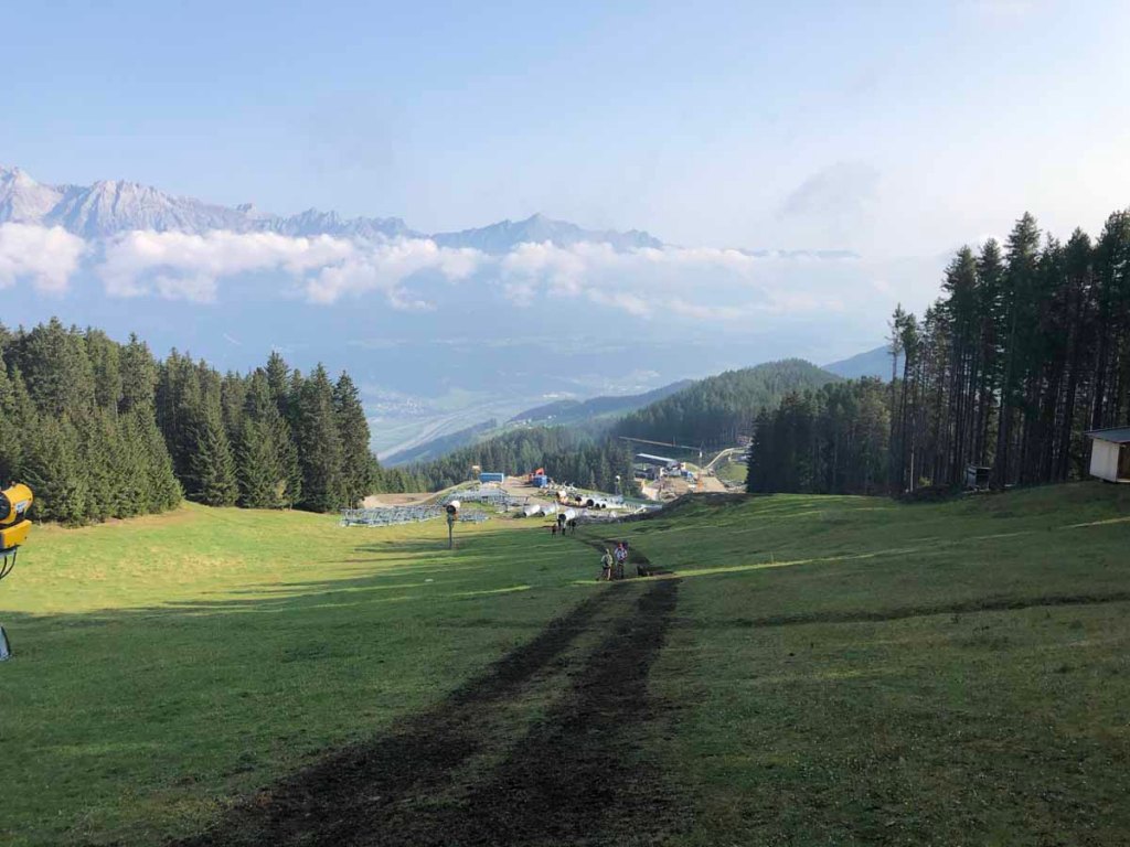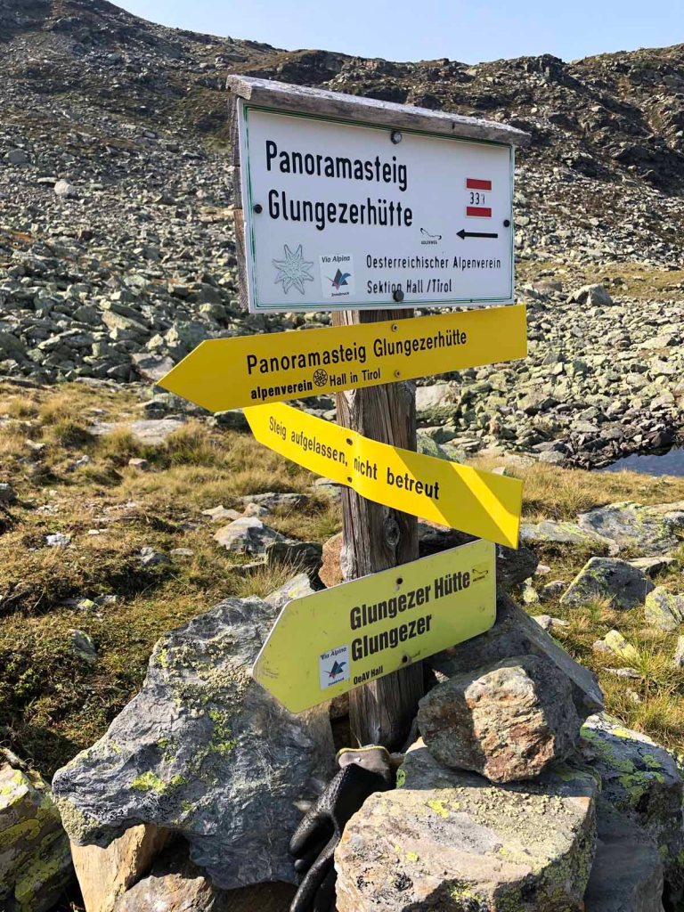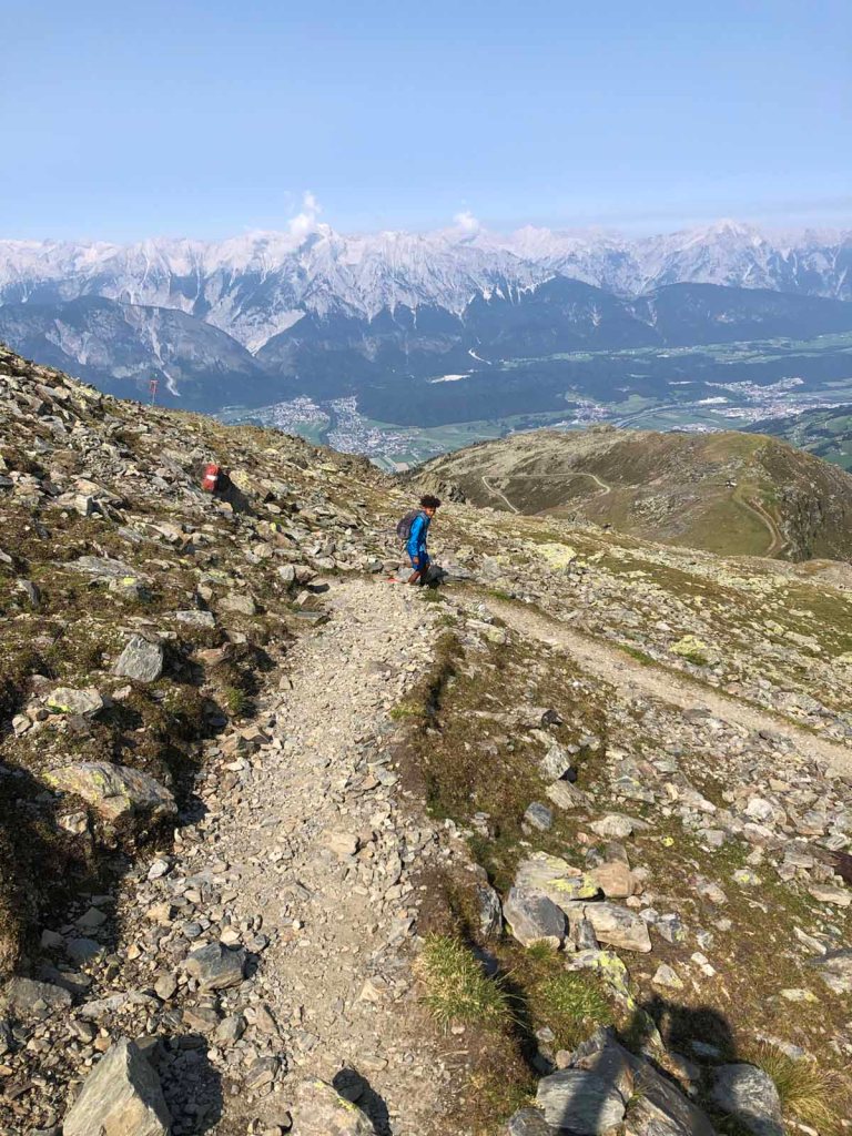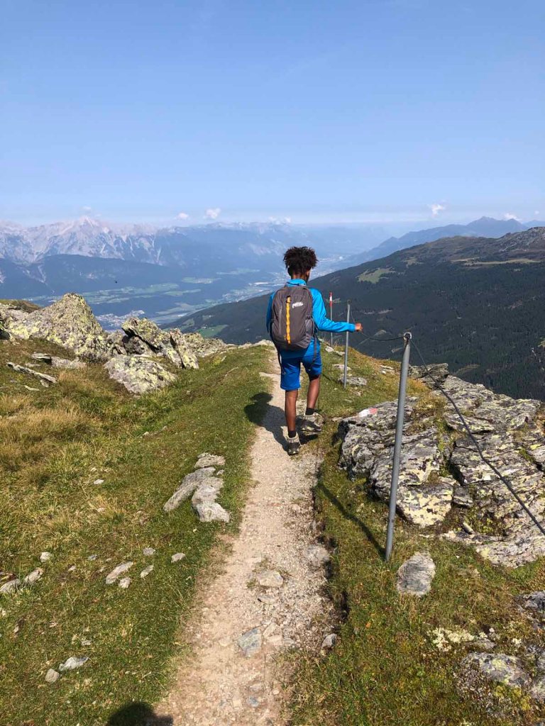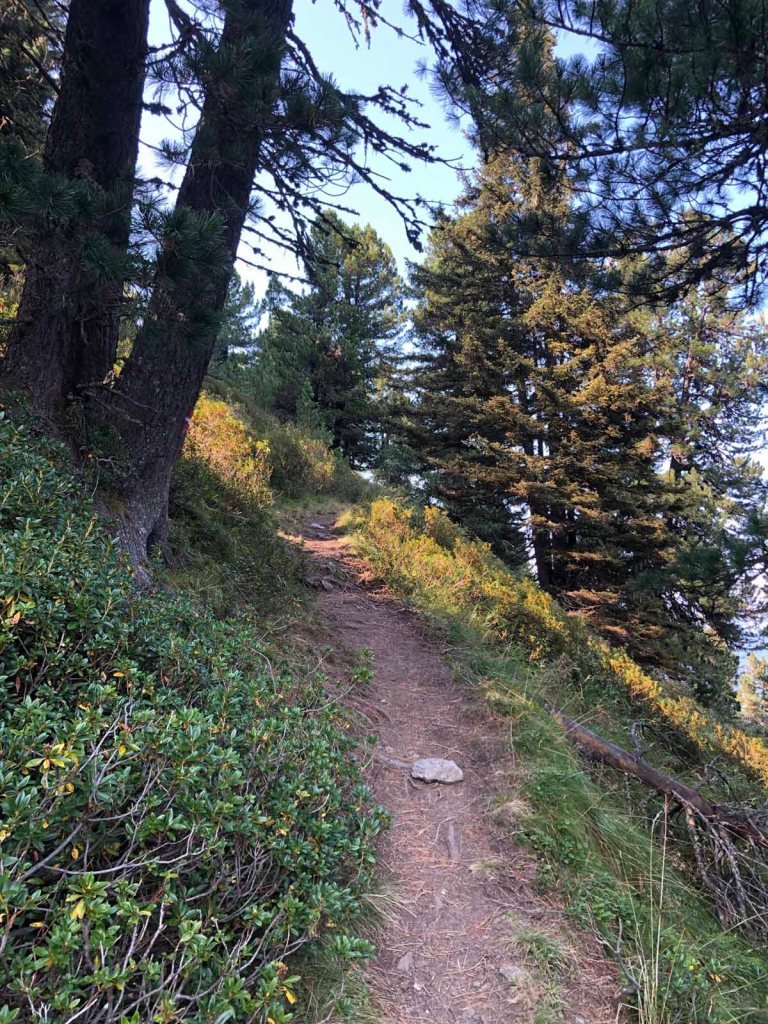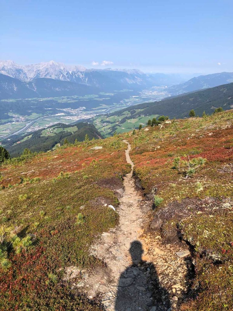 Nun folgen wir dem Schartenkogelsteig, bei der Abzweigung zur Bergstation nehmen wir den Alternativweg, der uns ein Stück hinunter ins Voldertal führt.