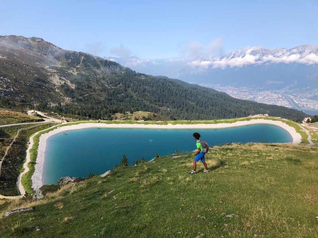 Ein Stück über der Bergstation ist der neue Speichersee zu sehen, wunderschön schaut das Wasser aus.