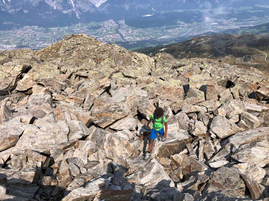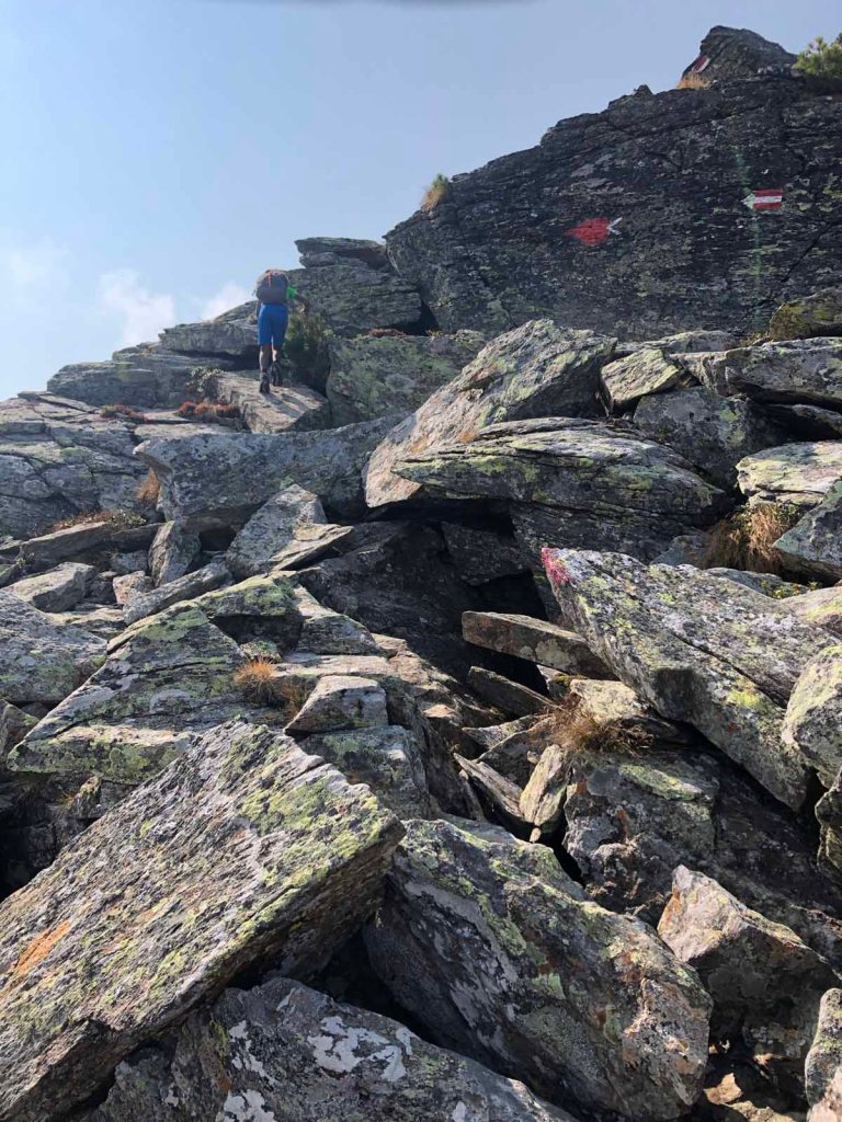 Nun müssen wir noch ein Geröllfeld durchqueren. Hier macht der Gang fast gleich viel Spaß wie der Klettersteig vorher. Weglos, aber nicht ohne Markierungen steigen wir fast gerade hinauf zur Sonnenspitze. Wer wohl all diese Steine hier verteilt hat…
