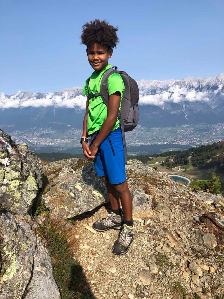 Wir sind recht durstig und haben fast keine Vorräte mehr, also beschließen wir, in der Glungezerhütte einzukehren. Diese ist nur 5 Minuten vom Sonnenspitzgipfel entfernt. Letu bekommt fürs brave Marschieren einen Kuchen, ich begnüge mich mit einem Isogetränk.
