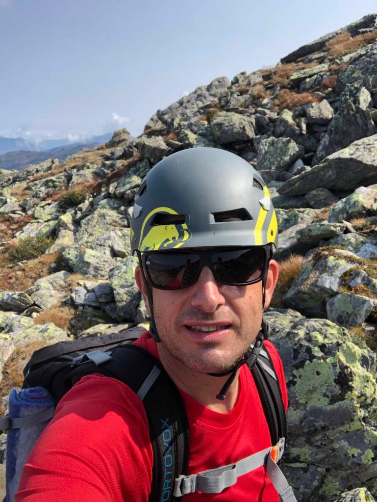 Zuerst müssen wir nur über ein paar Blöcke kraxeln, das geht auch noch ohne Ausrüstung. Auf einer kleinen Almmatte machen wir dann Pause, brotzeiten ein wenig und ziehen uns die Klettersachen an. Nun gehts los…