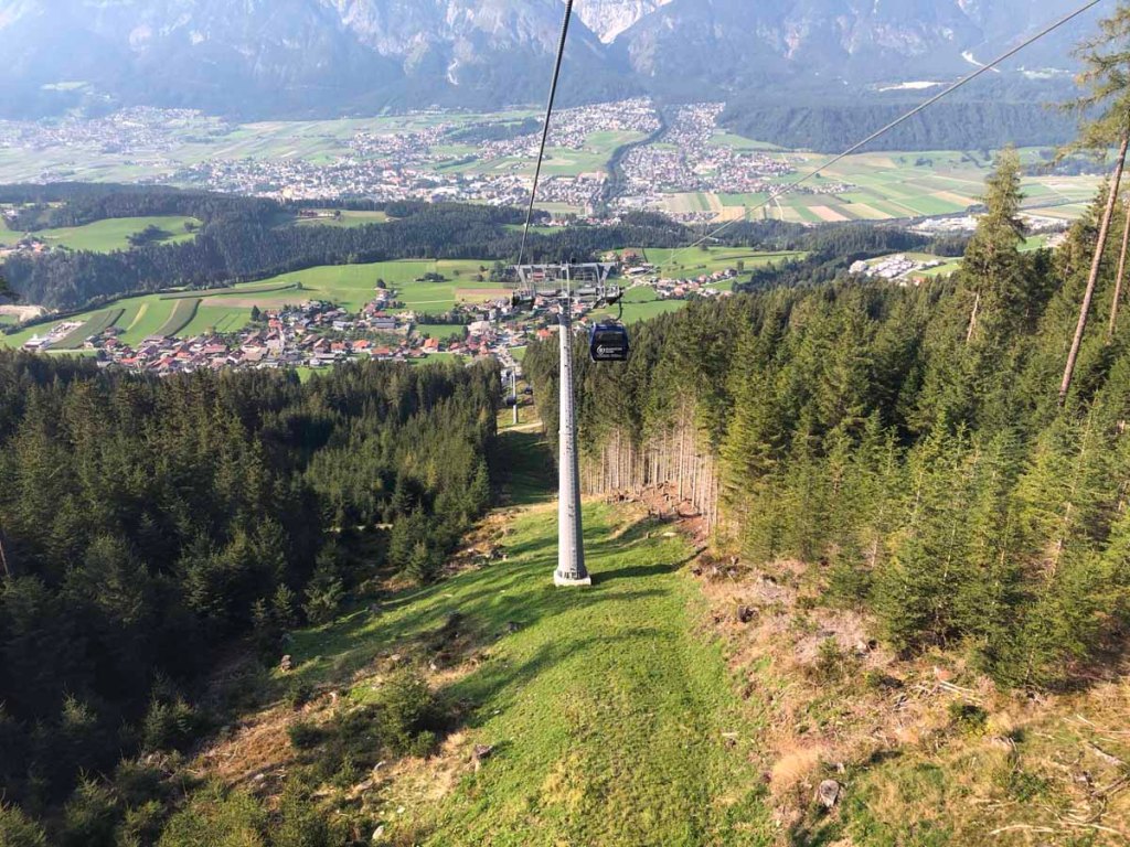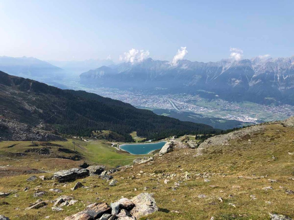 Die kleinen Wolken vom Vormittag haben sich fast verzogen, aber immer noch ist es relativ diesig. Der Blick auf Innsbruck ist trotzdem spektakulär.