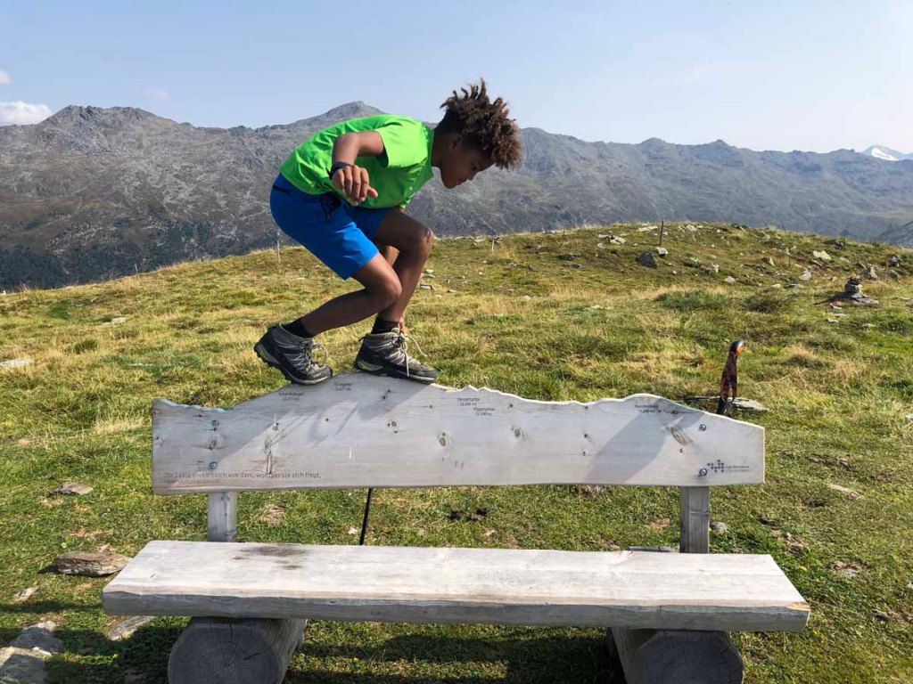 Direkt am Gipfel des Schartenkogels steht eine Bank mit allen Gipfeln der näheren Umgebung. Ein kurzer Vergleich zeigt uns, dass wir Beide schon alle gezeigten Gipfel erstiegen haben. Letu will es aber nochmals wissen, und steigt in Sekundenschnelle über alle Gipfel.