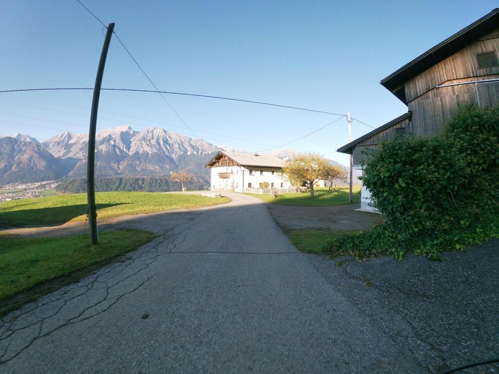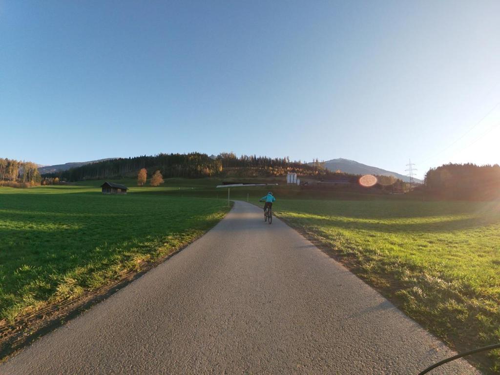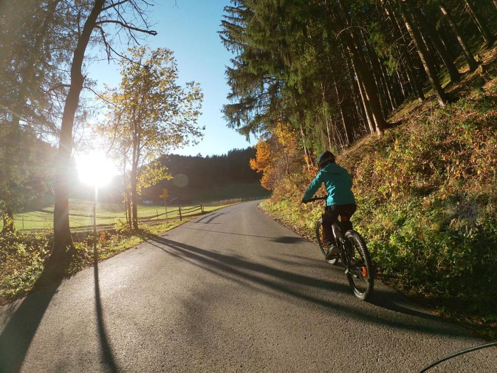 Flott geht es die enge, asphaltierte Straße hinunter, das macht uns richtig Spaß. Da kann man das Radl mal fein laufen lassen. Wir sausen an schönen Bauernhöfen, die hier hoch über dem Inntal thronen, vorbei.