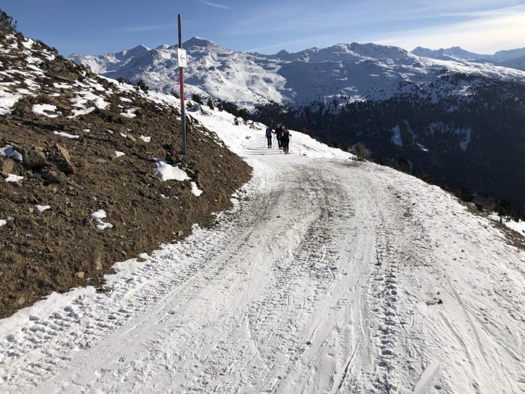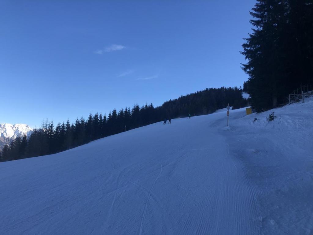 Bei der Mittelstation wechsel ich auf die „Vitalroute“, die von eben hier zur Hochmahdalm führt. Dazu muss ich erste in paar Meter abfahren, das mit Fellen gar nicht so einfach ist.