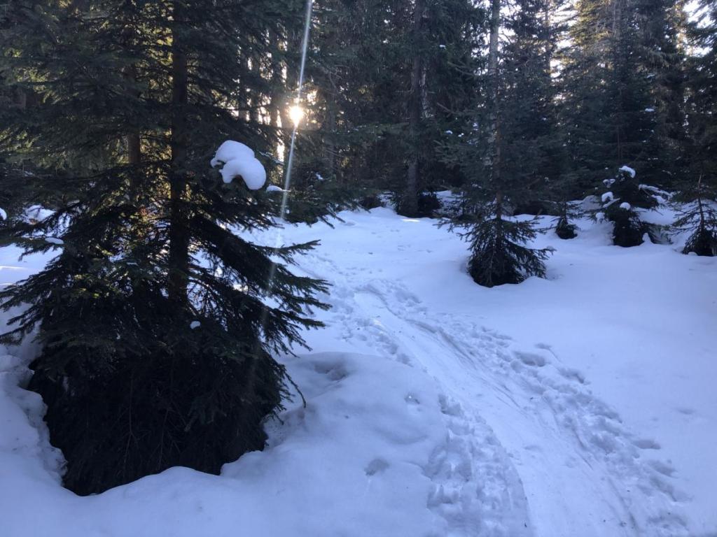 Dann zweigt eine schöne Spur in den Wald, die Richtung zum Gipfel stimmt, also probiere ich das mal aus. Meistens schön angelegt, führt die Spur durch schönsten Hochwald.