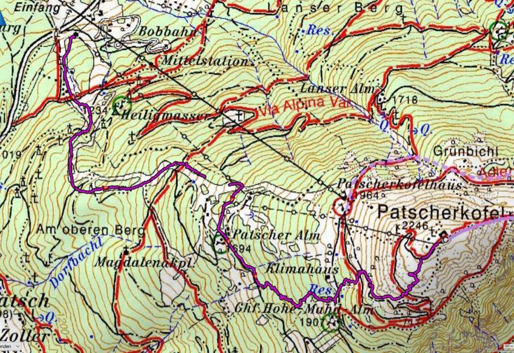 Schon bald steigt der Weg wieder an, im Sichtfeld die Patscher Alm, die einen Steinwurf von der Mittelstation entfernt ist. Ab hier geht es in den Wald, ich folge ein paar Metern der Forststraße.