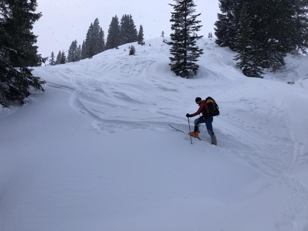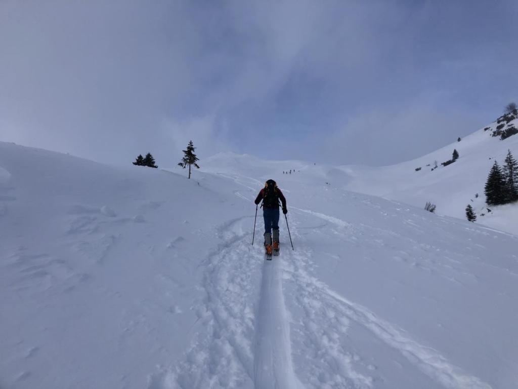 Der Schnee wird immer mehr, das Wetter ist nicht besser geworden, und trotzdem genießen wir jeden Schritt in dieser schönen Landschaft. Der Wald lockert auf und bald erreichen wir schönstes Skigelände.