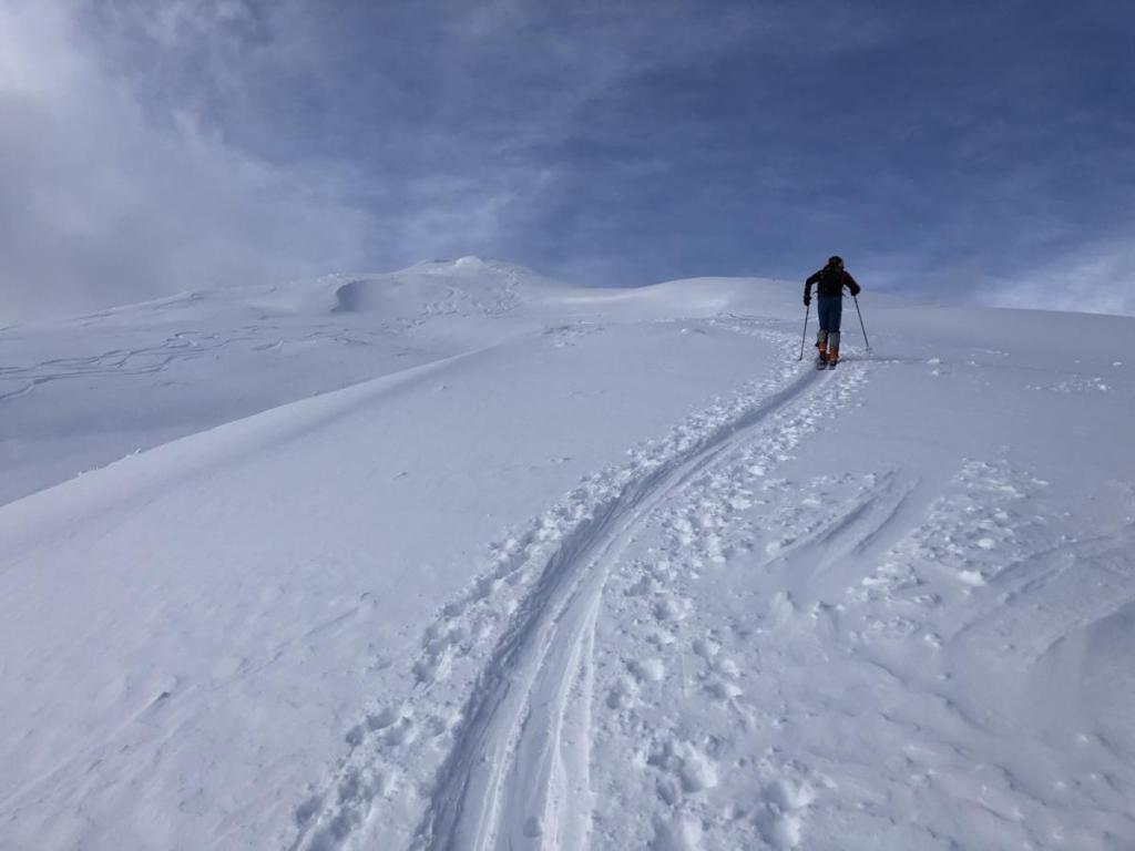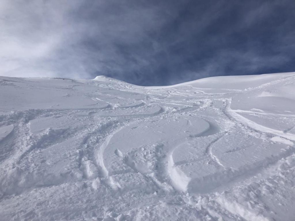 Die ersten Meter vom Gipfel sind mühsam, windgepreßter Schnee, teilweise pickelhart macht die Abfahrt nicht ganz einfach. Doch dann kommt ein Stück mit Pulverschnee und dort macht die Abfahrt Spaß.