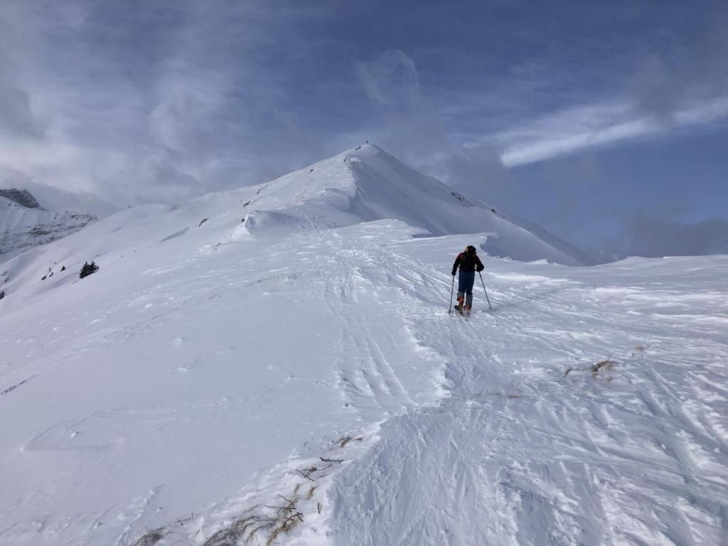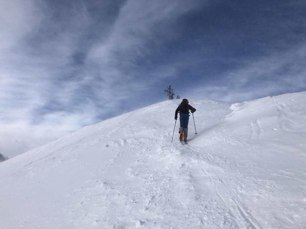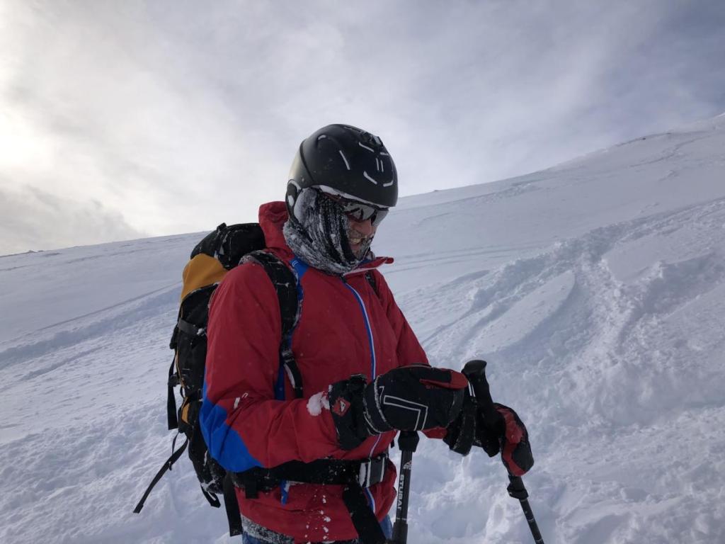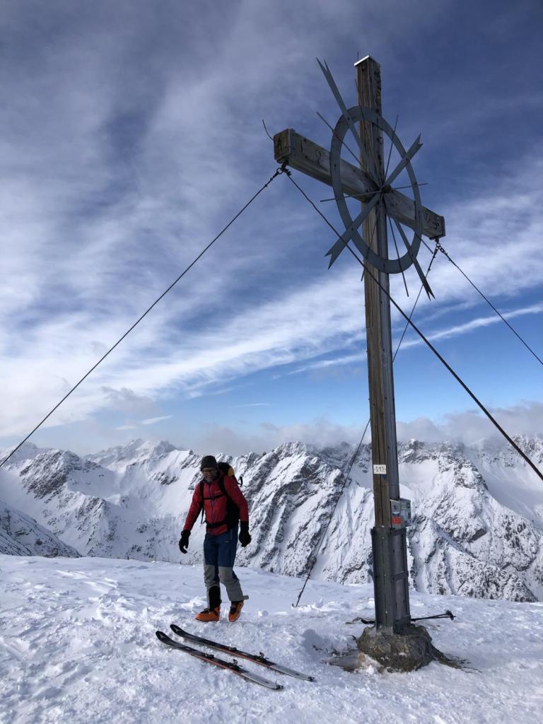Rasch haben wir am Gipfel unsere Siebensachen erledigt, die Felle eingepackt, eine Jacke angezogen und die Abmarsch-, bzw. Abfahrsbereitschaft hergestellt. Dennoch, und obwohl wir wirklich schnell waren, schmerzen die Finger dank des Windes doch ganz „zagrisch“.