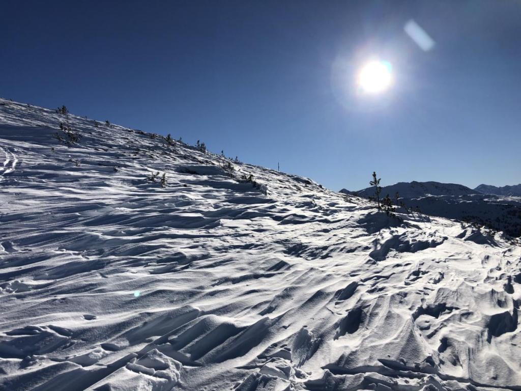 Je näher ich dem Gipfel komme, desto mehr sieht man den Einfluss des Windes. Es hat schon einige Zeit nicht mehr geschneit, die Schneedecke ist windgepresst und überall sieht man „Gangeln“. Kein gutes Zeichen, aber in diesem Falle vernachlässigbar, da der Kofel extrem verspurt ist.