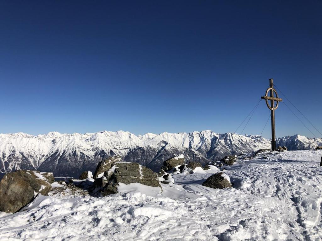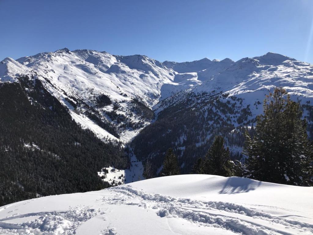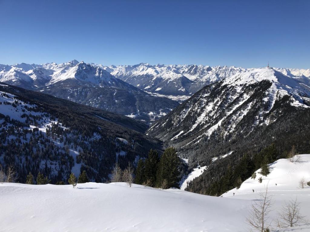Der Blick Richtung Süden offenbart ein weiteres „Wunderland“ für Tourengeher. Das oft übersehene Viggartal mit schönen Skibergen, im Hintergrund die Kreuzspitze (2.746m) und das Rosenjoch (2.798m)