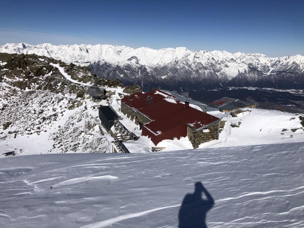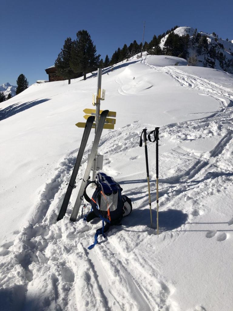Die Pause tut gut, ich merke allerdings, dass ich bedingt durch den nun einsetzenden Wind auskühle. Da ich eine tolle Abfahrt vor mir habe, packe ich zusammen. Nach der Hütte muss ich nochmals ein paar Meter in die Schulter der Sonnenspitze aufsteigen, denn dort startet die eigentliche „Piste“.