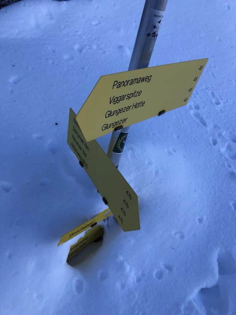 An den Wegweisern kann man erkennen, dass hier viel Schnee liegt. Bei einer Abzweigung des Zirbenweges sehe ich die Viggarspitze in voller Pracht. Eine schöne geformter Pyramide…