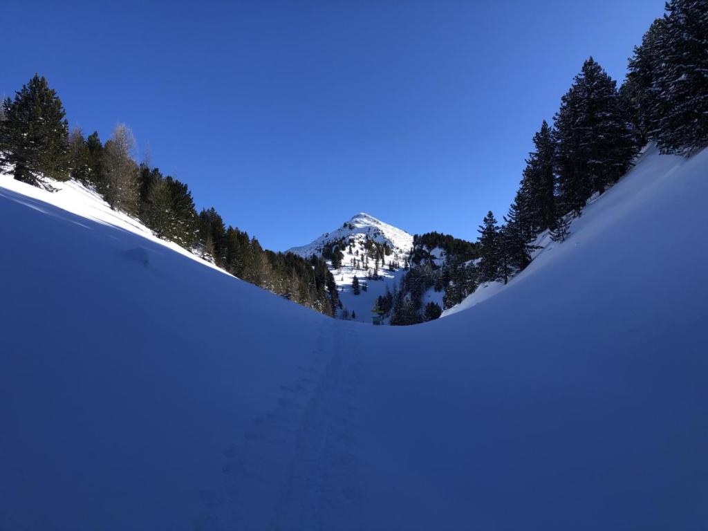 Nach ein wenig „Tretteln“ erreiche die das Lanser Kreuz, nun steht wieder eine schöne Steile Abfahrt vor mir. Zum Glück habe ich die Felle noch nicht „montiert“.