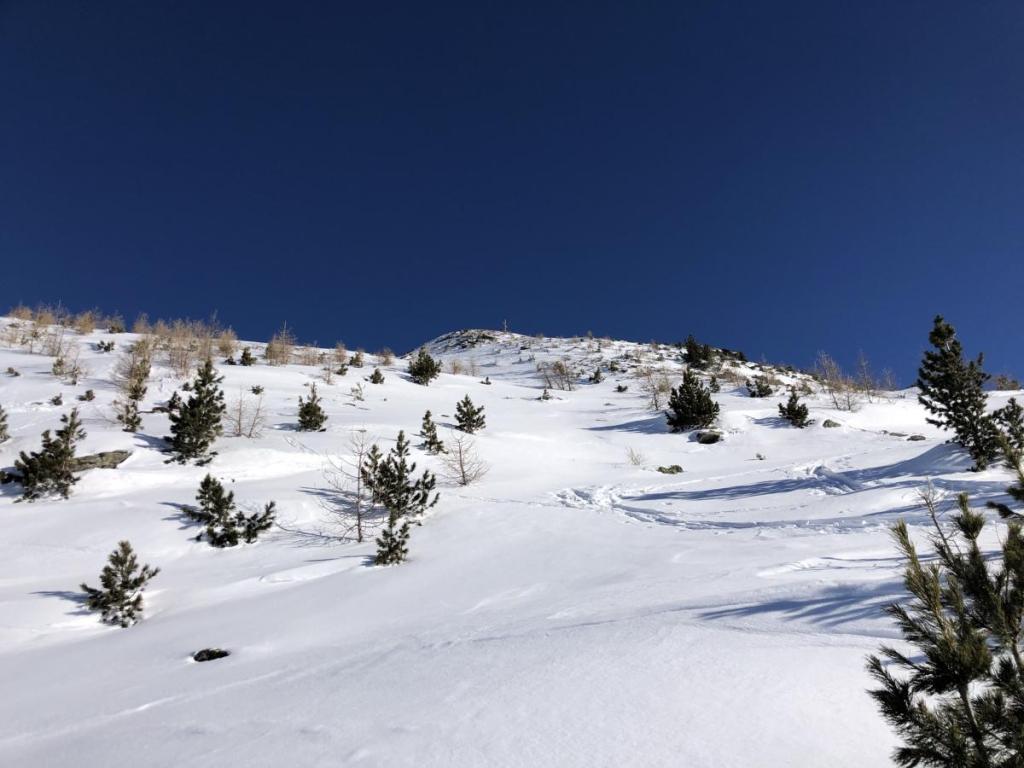 Am Gipfel ist es sonnig, windstill und sehr angenehm. Dennoch kann ich nicht verweilen, ich habe noch eine gute Strecke vor mir. Ich begebe mich zum Osthang, oberhalb dessen ich abfelle und mich für die erste Abfahrt des Tages bereit mache.