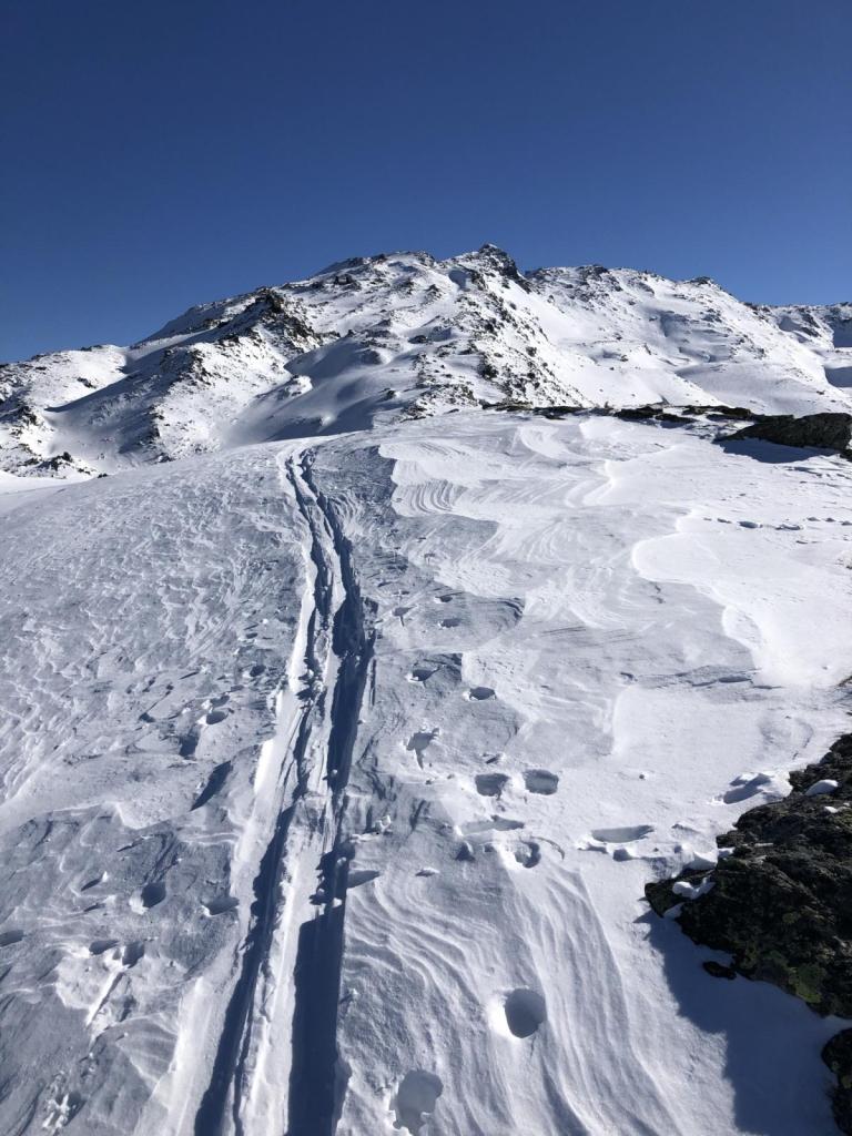 Einer der kleinen Nachteile dieser Tour ist die immer wieder dünne Schneeauflage am Grat. Da es in dieser Region immer windet, ist der Schnee teilweise verblasen. Dennoch finde ich ski-schonende Spuren zum Abfahren.
