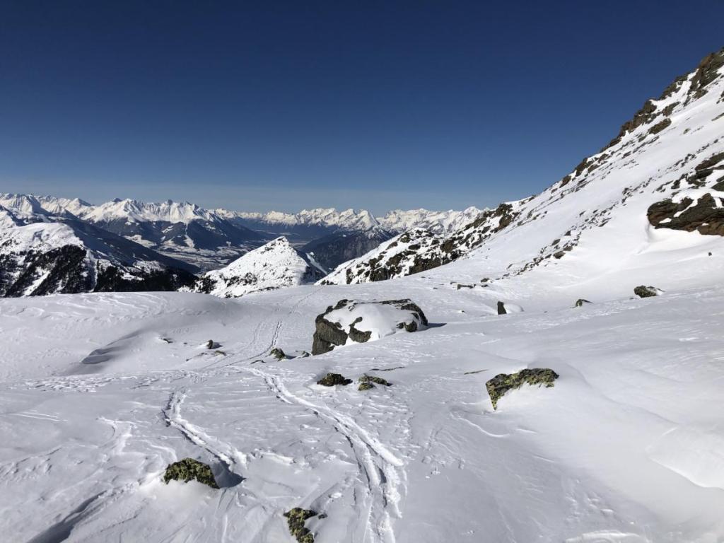 Da ich eine längere Strecke vor mir habe, lasse ich die Viggarspitze heute aus. Das nächste Mal stehe ich wieder dort oben. Der Blick ins Viggartal und zurück auf den Patscherkofel zeugt recht deutlich, dass dieses Tal recht langzogen ist. Die Skitouren am Talschluss sind dementsprechend auch niemals „kurz“…
