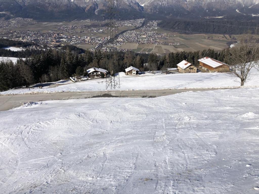 Vom Gipfel, mit Buckelpiste, über die sehr gut präparierte Piste im Skigebiet und schlussendlich über die gesperrte, weil teilweise recht eisige Talabfahrt erreiche ich zufrieden die Talstation der Glungezerbahn. Beim Weg zur Bushaltestelle hole ich mir noch ein Bier bei der Larchhittn, dann warte ich in der Sonne auf den Bus.