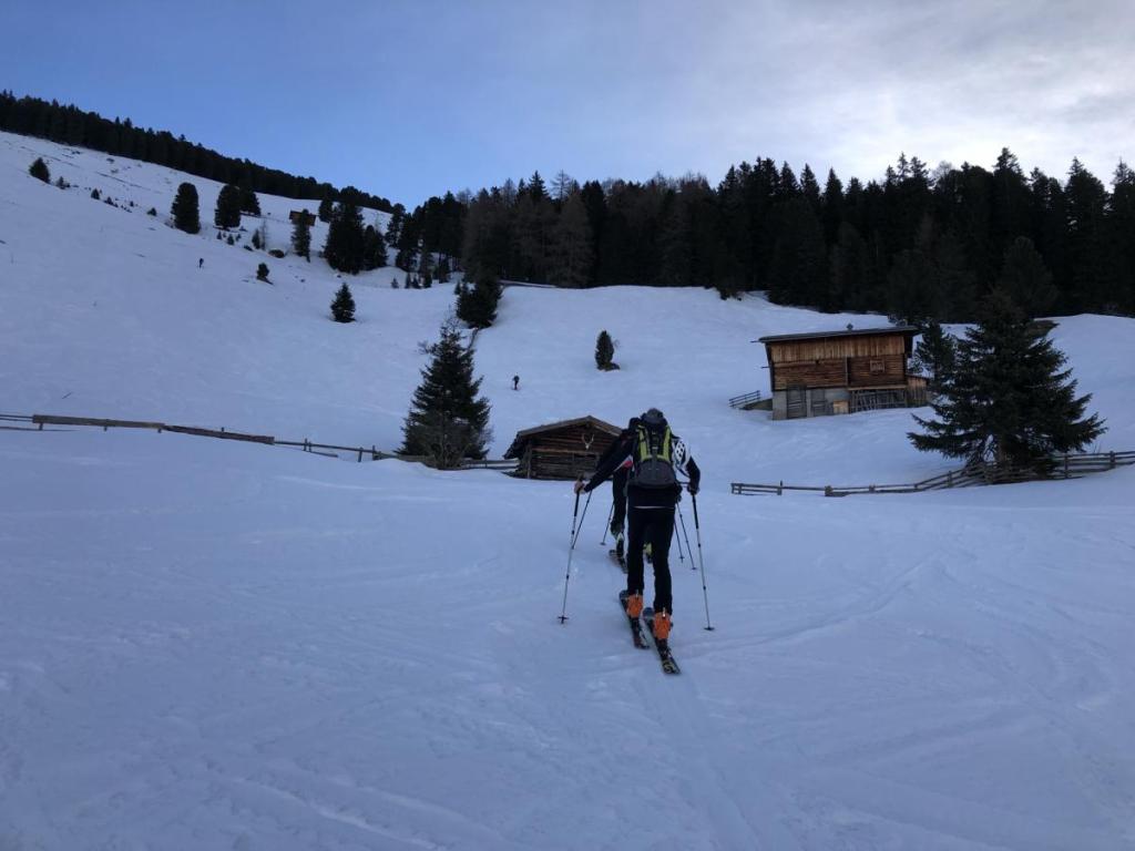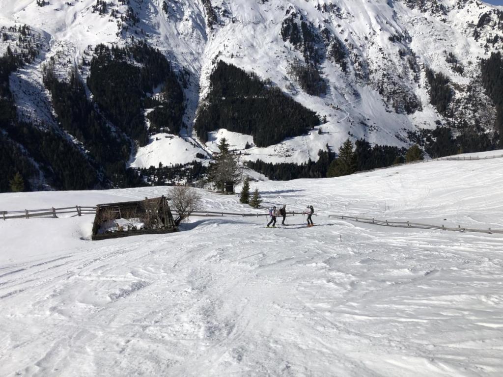 Der Start verläuft recht unspektakulär über eine Forststraße, bei deren Ende wir auf schönes Almengelände stoßen. Steil zieht die Spur nun über noch sehr harten Schnee nach oben.