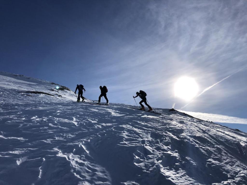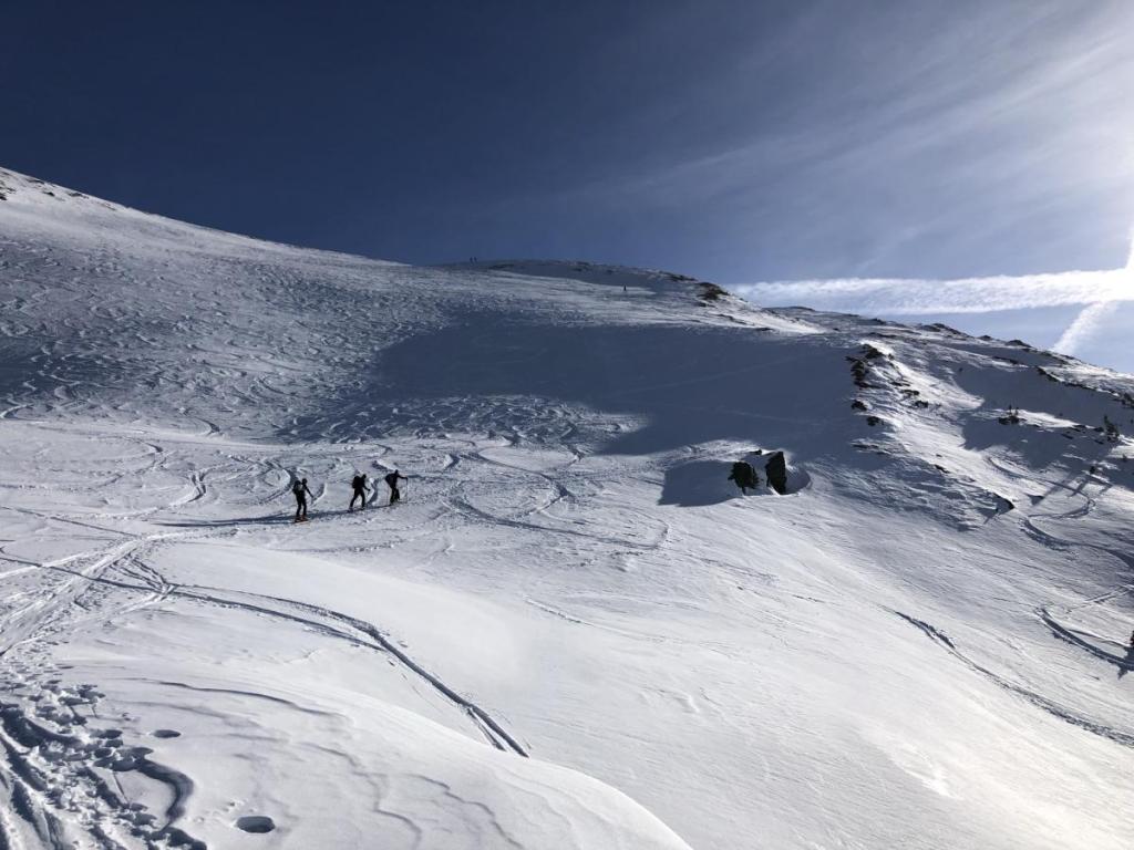 Schöne Skihänge eröffnen sich vor uns, einzig über die Schneequalität sind wir uns noch nicht einig. Aber bevor überhaupt ein Gedanke an die Abfahrt verschwendet wird, wir haben noch ca. 600 Hm vor uns…