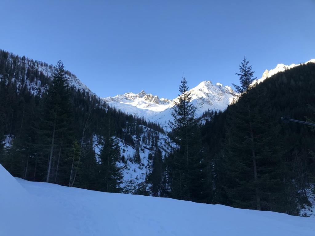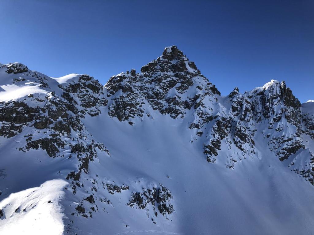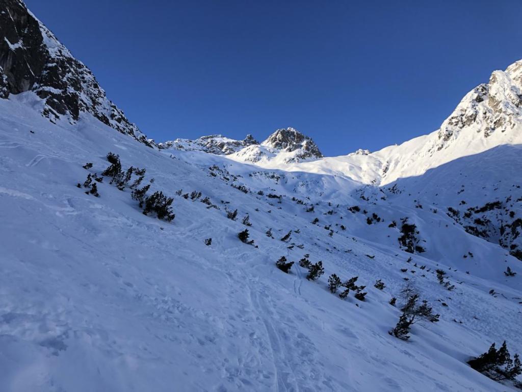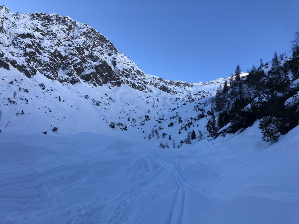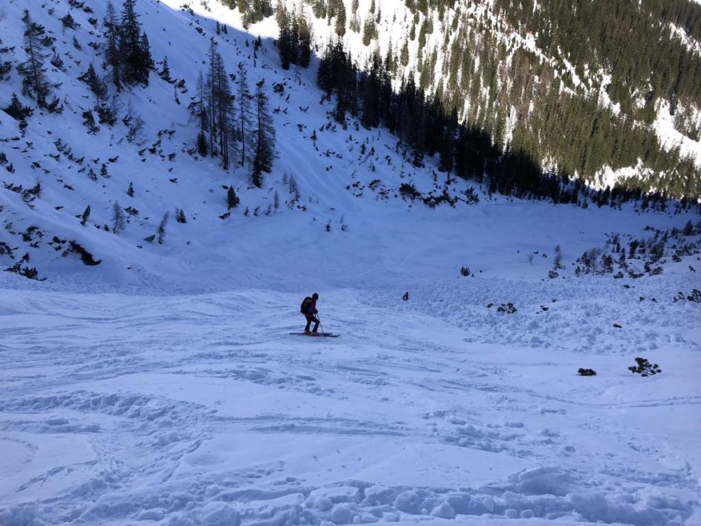 Schließlich öffnet sich das Tal ein wenig und wir sehen auf den weiteren Wegverlauf. Ein paar alte Lawinen säumen den Weg, doch die Gefahr ist heute überschaubar. Mehr Kopfzerbrechen besorgt uns die schlechte Qualität des Schnees im Kessel.