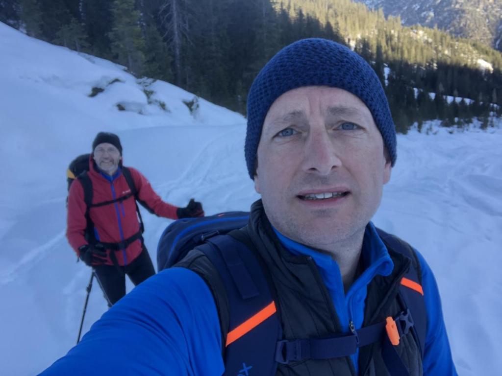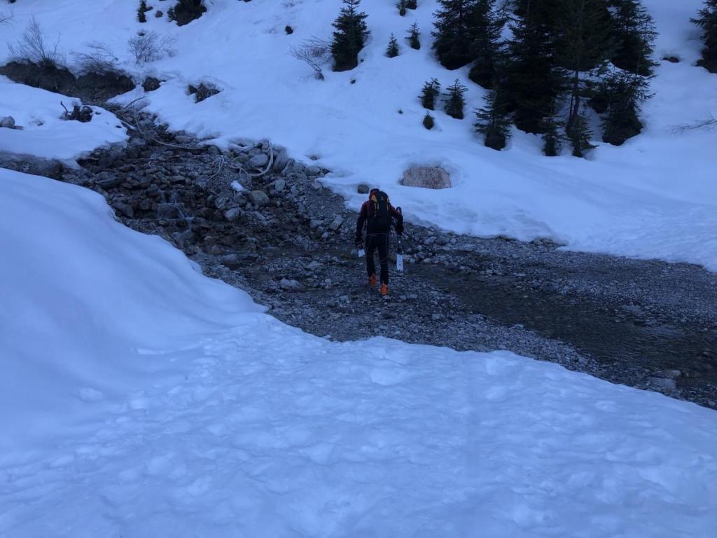 Der Weg verläuft parallel zum Alpbach, einmal müssen wir den Wasserlauf überqueren. Dazu heißt es, Ski aus und rüberlaufen.