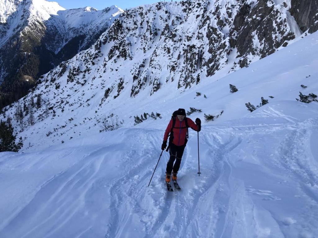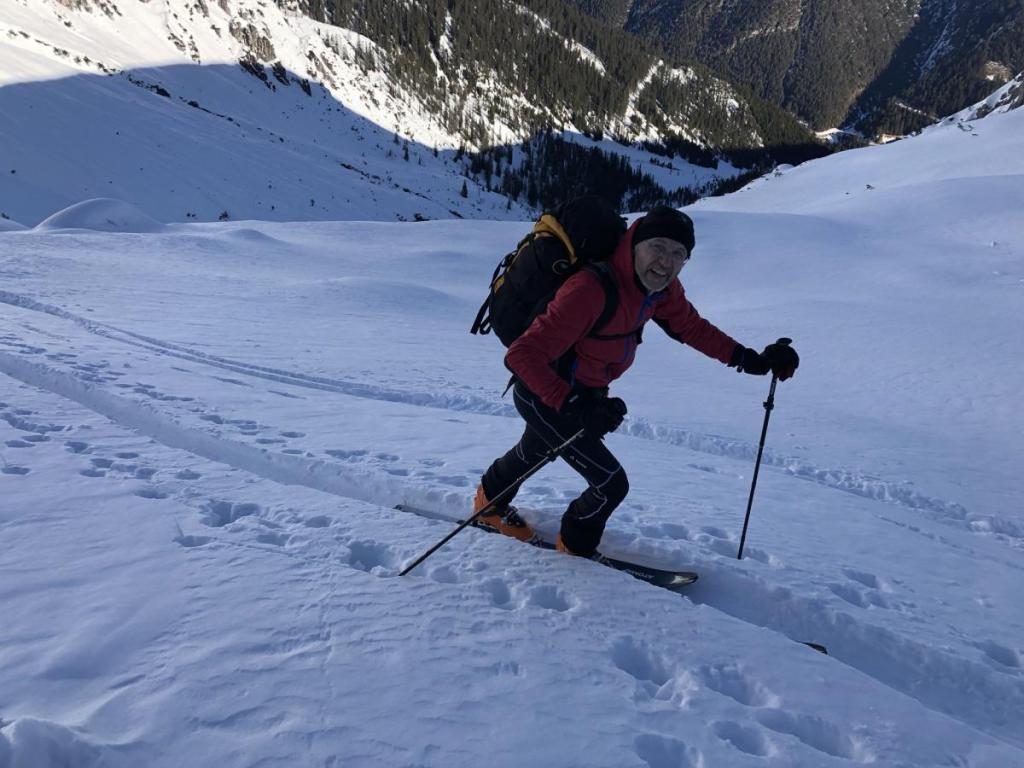 Die Spur zieht nun mal mehr oder weniger steil in das Schafkar. Die eisigen Stellen sind nun Pulver gewichen und der Aufstieg geht flott voran.