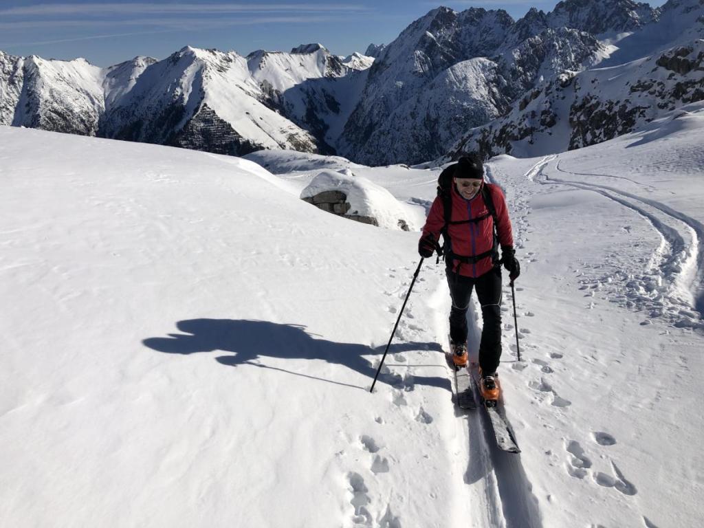 Die Schneequalität ist hier nun schon sehr gut, der lange Schatten zahlt sich aus. Doch schon bald lugt die Sonne am Grat hervor, nun wird es warm.