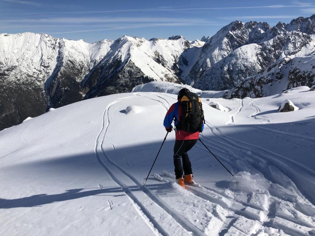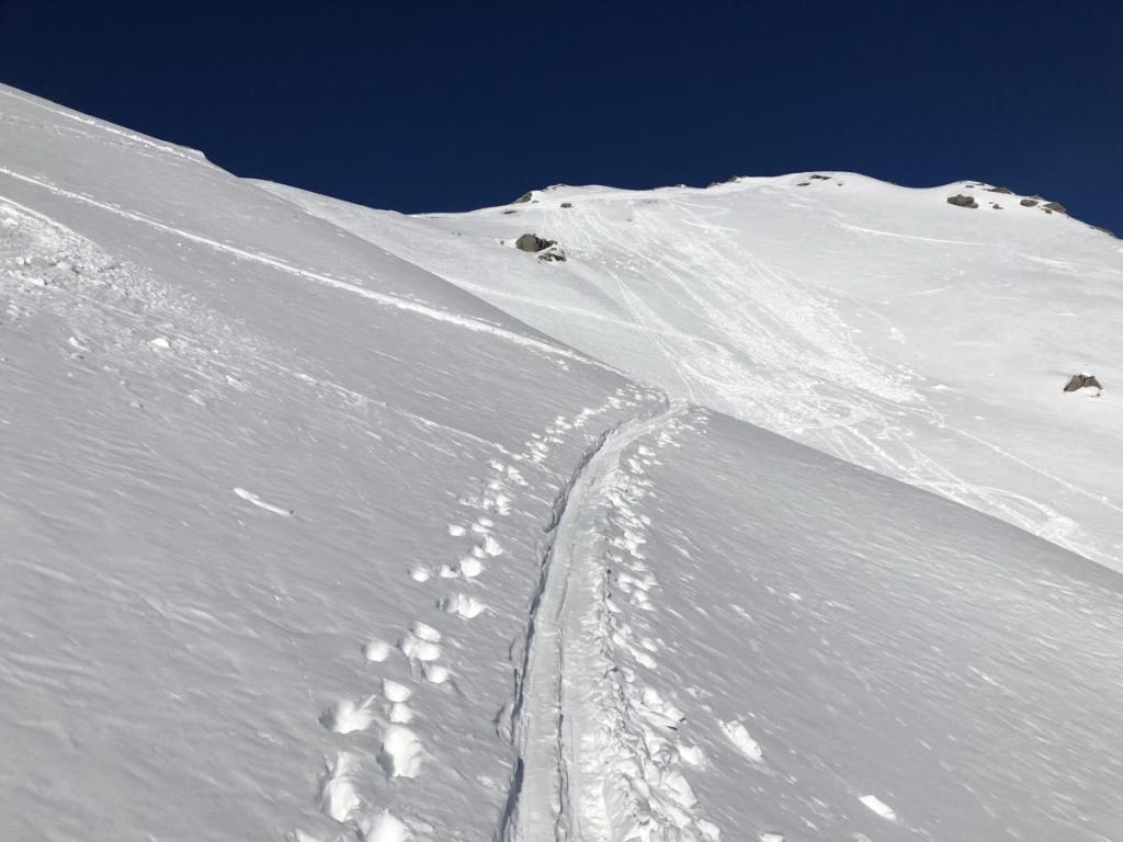 Nach einer ausgiebigen Pause machen wir uns an die Abfahrt. Der obere Teil ist wunderbar zu fahren, einzig an der Technik scheitert es heute, der Schnee ist wunderbar. Dennoch kommen wir zügig bis zum Steilhang mit dem Lawinenstrich.