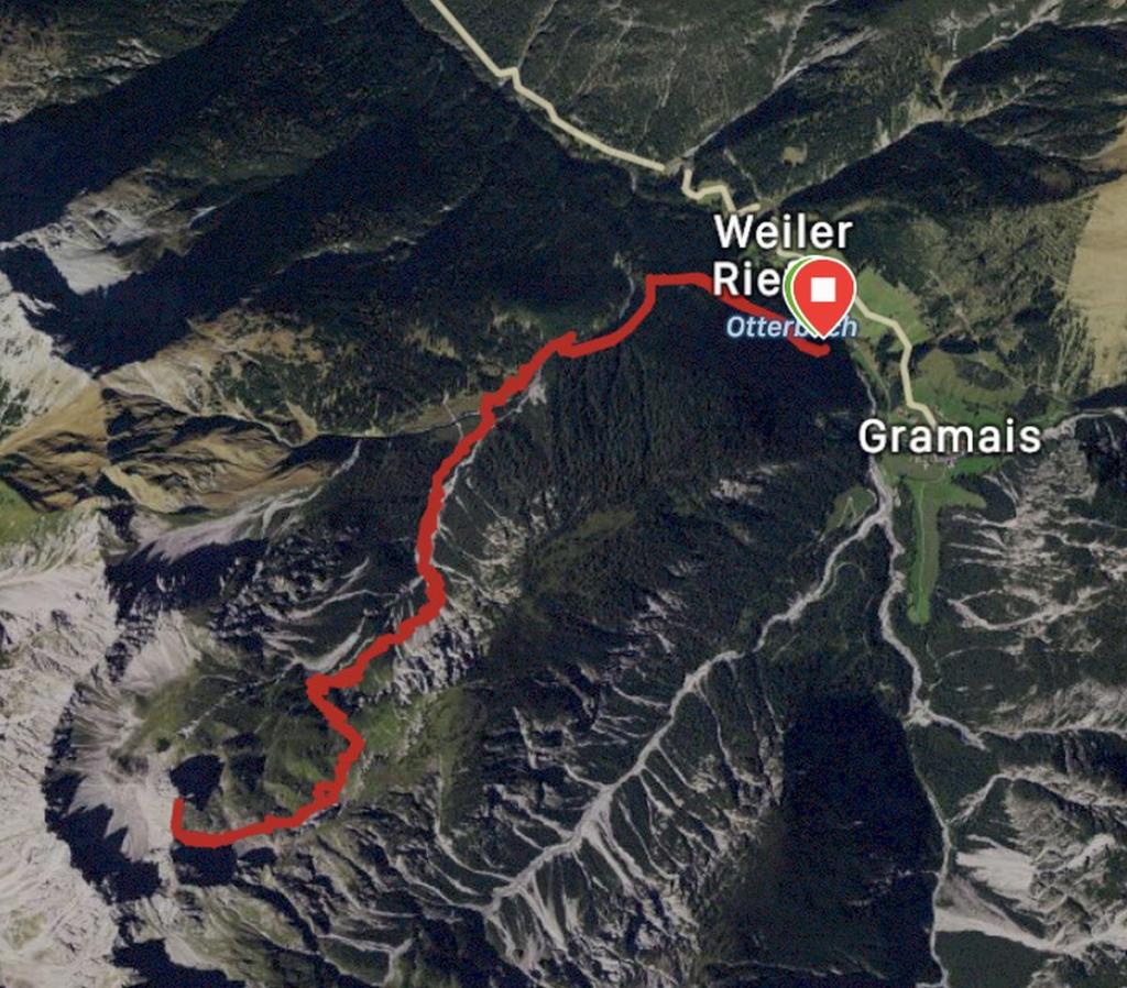 Am Weg von Gramais nach Häselgehr bleiben wir noch einmal stehen und schauen zu unserem Tagesziel empor… relativ abweisend erscheint der Gipfelhang von hier…